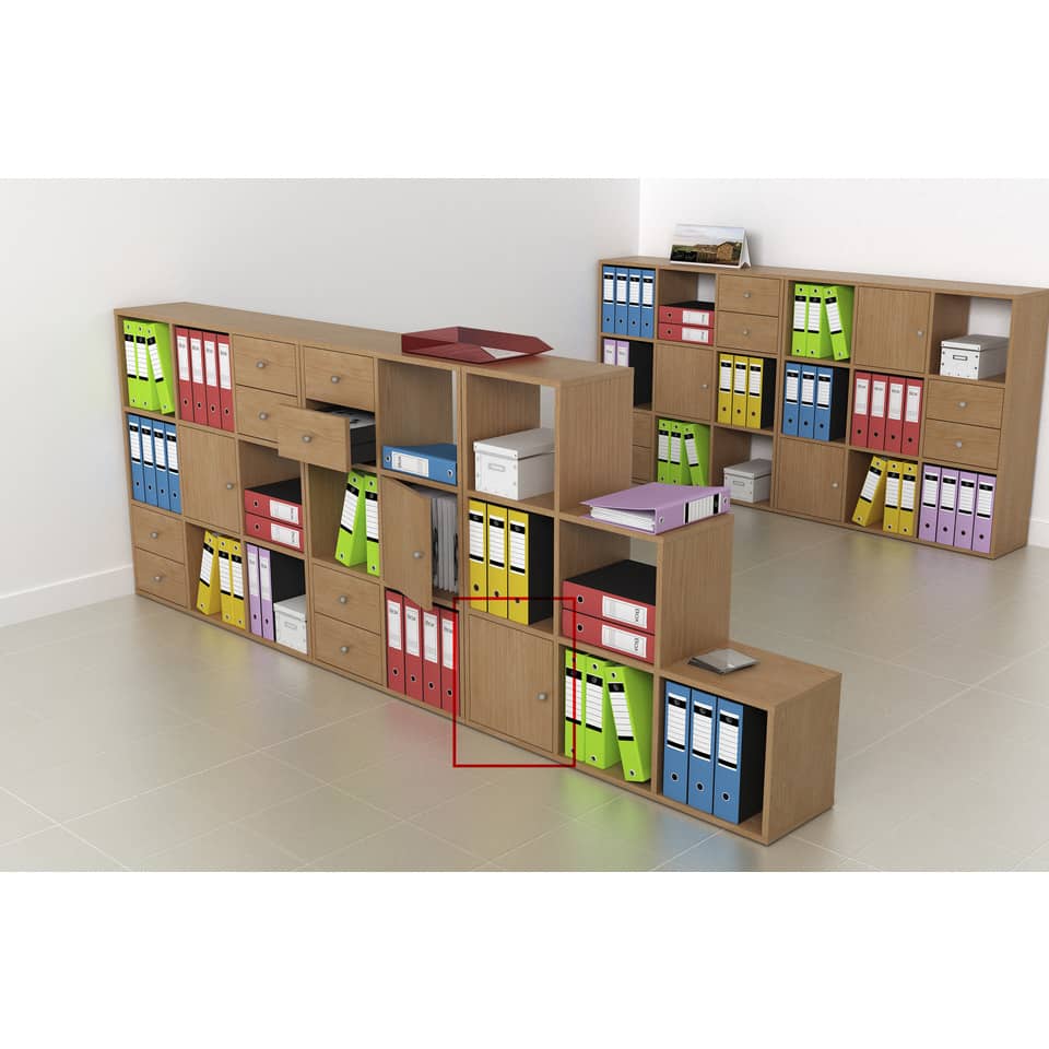 La casella della libreria misura cm 32,2 x 32,2 e può contenere i raccoglitori formato commerciale, altezza max cm 32. Profondità utile: 29 cm. Rifinite su entrambi i lati possono essere collocate al centro di una stanza come divisorio. Noce (entrambi i lati con bordo colore noce)