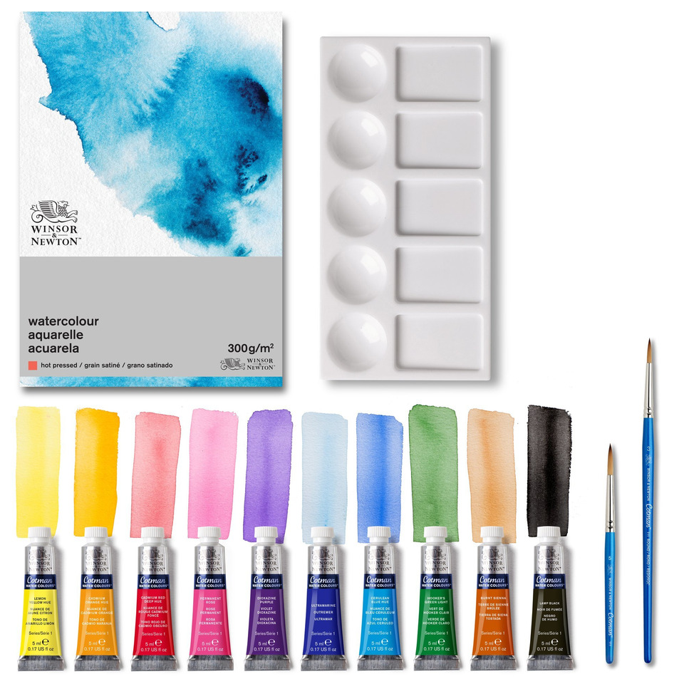 Tutto ciò che serve per dipingere con gli acquarelli e iniziare a vedere il mondo attraverso gli occhi dell'artista. La confezione comprende 10 tubetti Cotman da 5 ml nei colori terra di Siena bruciata, arancio cadmio, rosso scuro, cadmio, blu ceruleo, viola diossina, verde Hooker chiaro, nero fumo, giallo limone, rosa permanente, blu oltremare; 1 blocco per acquarello da 300 g, formato 17,8 x 25,4 cm, 20 fogli; 2 pennelli Cotman Serie 111 n° 3 e n° 5 (da viaggio); 1 tavolozza rettangolare.