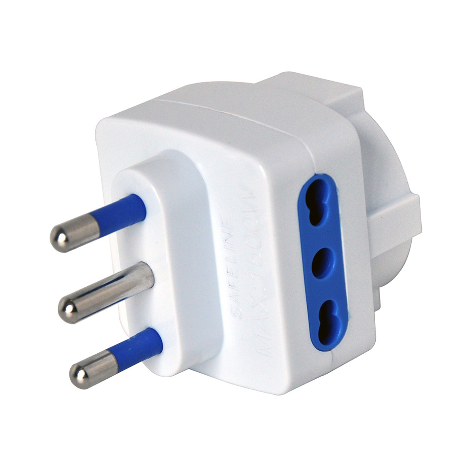 Adattatore di rete triplo. Composizione: spina 2P+T 16A, 2 prese 2P+T bipasso 10/16A, 1 presa 2P+T 16A Schuko. Colore bianco. Imballo singolo in sacchetto polybag con etichetta.