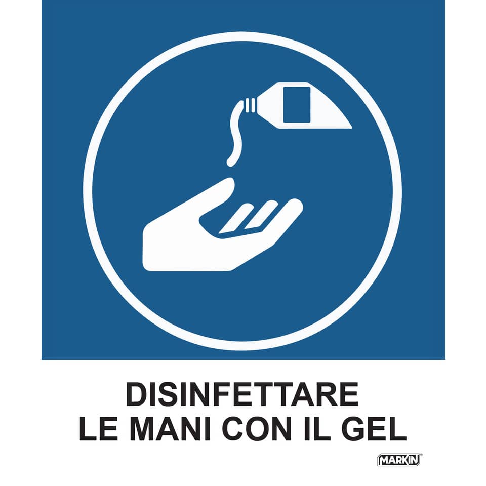 Adesivi segnaletici Markin “Disinfettare le mani con il gel” in LWM – 12,5×15,2 cm – X110COV-5 (conf.2)
