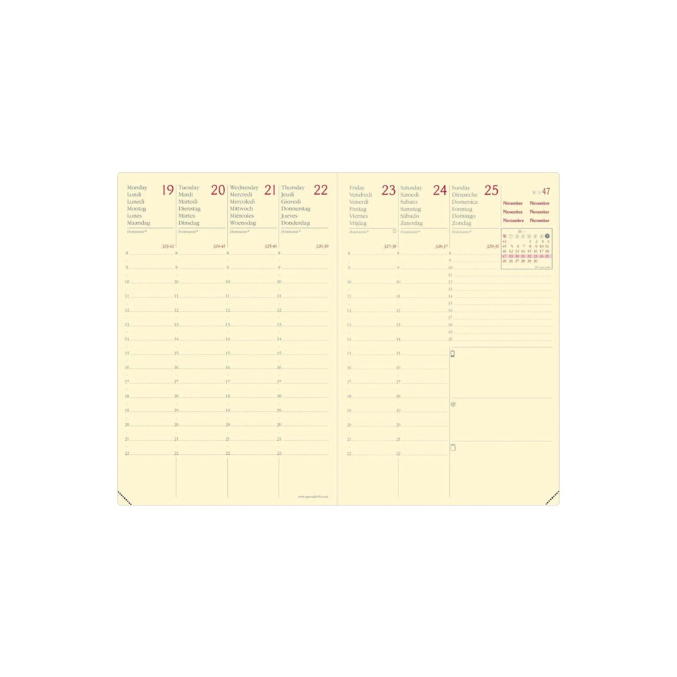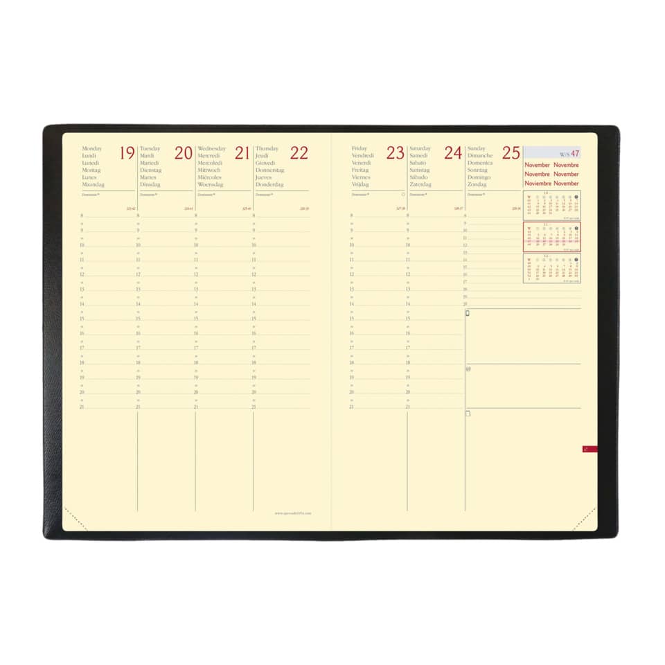 Agenda settimanale Affari Prestige Silk, la settimana su 2 pagine per avere una visione panoramica in un solo colpo d'occhio. Per ogni pagina doppia include uno spazio libero per appuntare i tuoi promemoria (persone da contattare, cose da fare...). Carta avorio Clairefontaine per una scrittura morbida e fluida e angoli perforati removibili per orientarti facilmente e rapidamente.