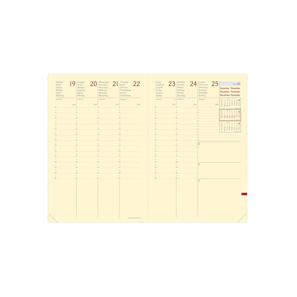 Agenda settimanale Affari Prestige Silk, la settimana su 2 pagine per avere una visione panoramica in un solo colpo d'occhio. Per ogni pagina doppia include uno spazio libero per appuntare i tuoi promemoria (persone da contattare, cose da fare...). Carta avorio Clairefontaine per una scrittura morbida e fluida e angoli perforati removibili per orientarti facilmente e rapidamente.