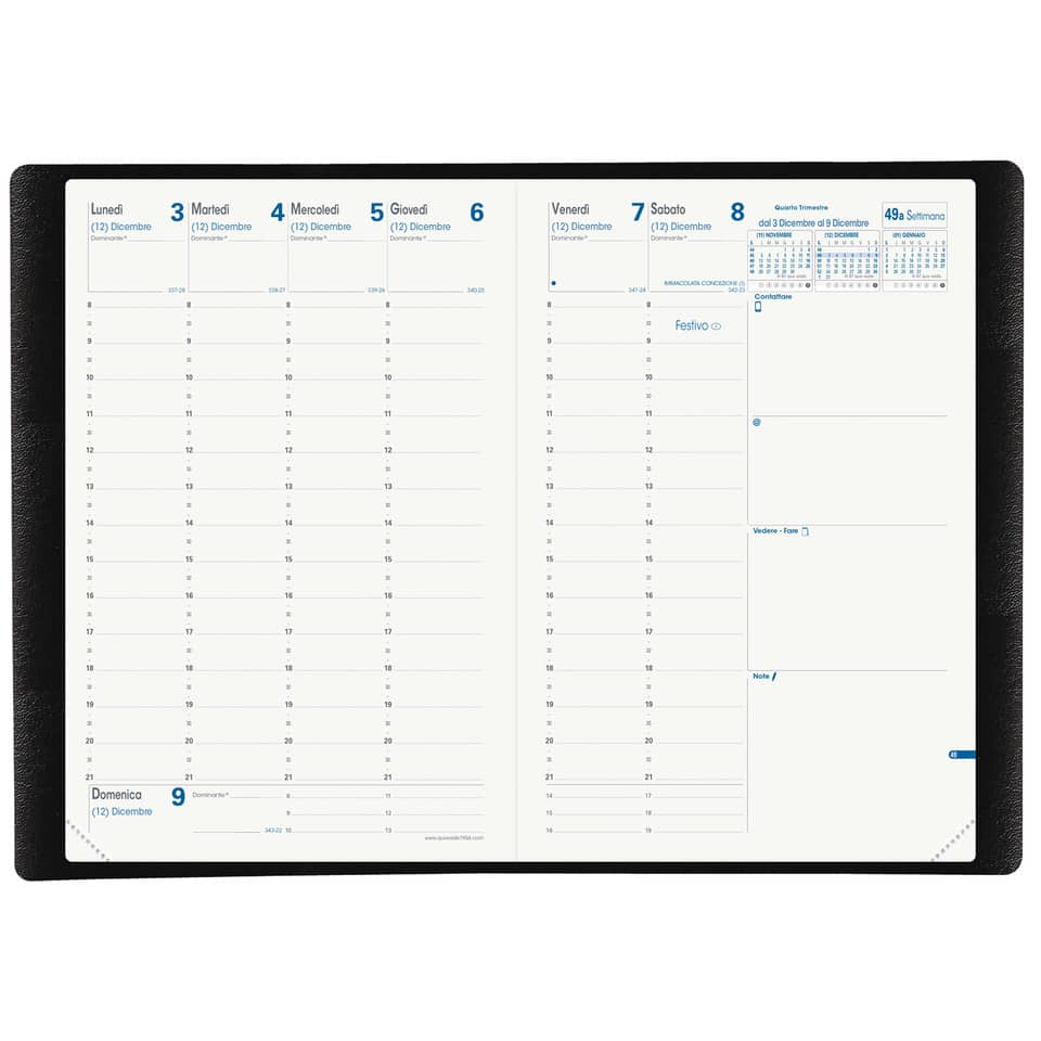 160 pagine. Formato 16x24 cm. Impaginazione settimanale, orientamento della visuale verticale. Fascia oraria 8h - 21/23h, sezione appuntamenti: Mezz'ora.