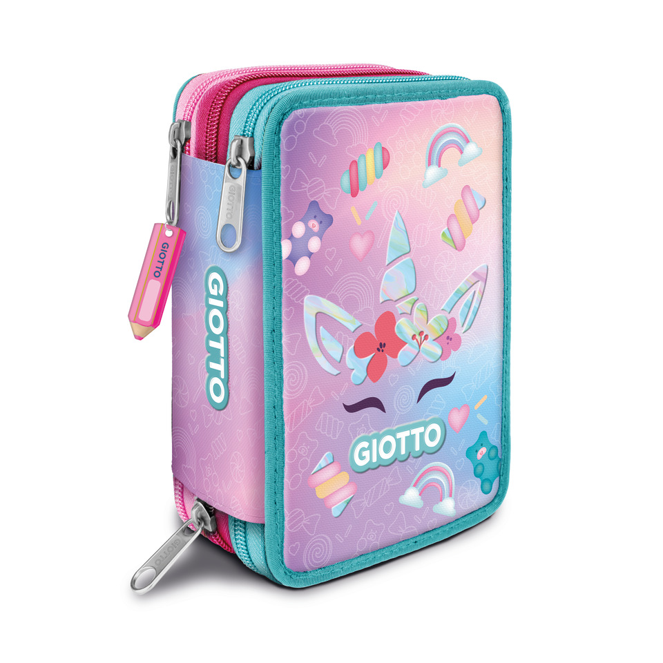 GIOTTO, da oltre 100 anni è sinonimo di scuola e colore. Con i suoi prodotti di qualità è presente da sempre negli astucci di tutti i ragazzi. F.I.L.A., per il ritorno a scuola 2024, vuole dedicare a tutti i bambini i suoi nuovi astucci GIOTTO 3 ZIP. Curati nei minimi dettagli, realizzati con tessuti di qualità e riempiti con i migliori prodotti. Astucci in poliestere 900D, impermeabili e con cerniere in metallo. Candy Collection: una collezione super trendy a tema caramelle con un simpatico unicorno, eroe della comunicazione. 1 tessuto effetto glitter, 1 tessuto effetto jeans con glitter; 1 tessuro unicorno con effetto iridescente. Contenuto: 1x Colla Giotto Stick 10g; 1x Righello Giotto 15 cm; 1x Maxi gomma bianca Lyra Temagraph No-Sign; 1x Temperamatite Giotto foro s/m con serbatoio; 1x Forbice; 1x Penna cancellabile Tratto Cancellik colore rosso; 1x Penna cancellabile Tratto Cancellik colore blu; 1x Penna sfera Tratto Uno Green Plastic colore nero; 1x Matita grafite Lyra Temagraph HB; 1x Matita grafite Lyra Temagraph 2B; 18x Pennarelli Giotto Turbo Color; 18x Pastelli Giotto Supermina mina 4 mm. Dimensioni: L. 12,9 x P. 7,5 x H. 19,5 cm.