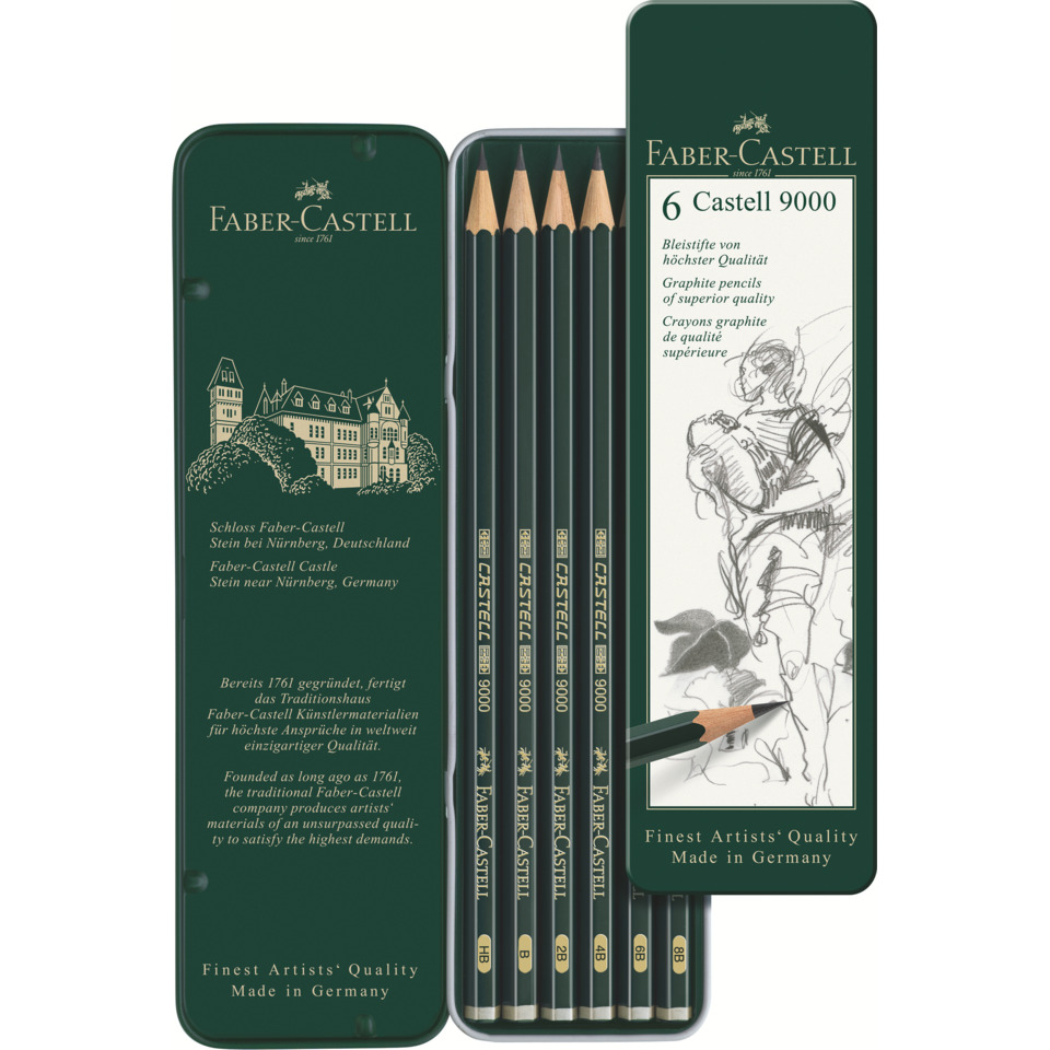 Set da 6 matite di grafite Castell 9000 di grafite di alta qualità con gradazioni di durezza HB, B, 2B, 4B, 6B e 8B. Ideali per lavori artistici, studi di alto livello e schizzi. Particolarmente resistenti agli arti, facili da temperare e da cancellare. Vernice ad acqua ecosostenibile.