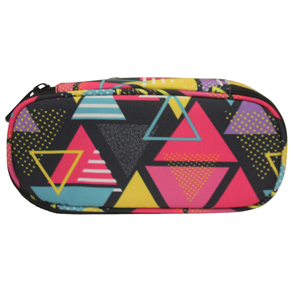 Astuccio ovalino con cerniera piccolo motivo triangolo colorato. Forma ovale. Aletta interna con passanti per penna. Materiale: poliestere. Dimensioni: 21 x 5,5 x 10,5 cm.