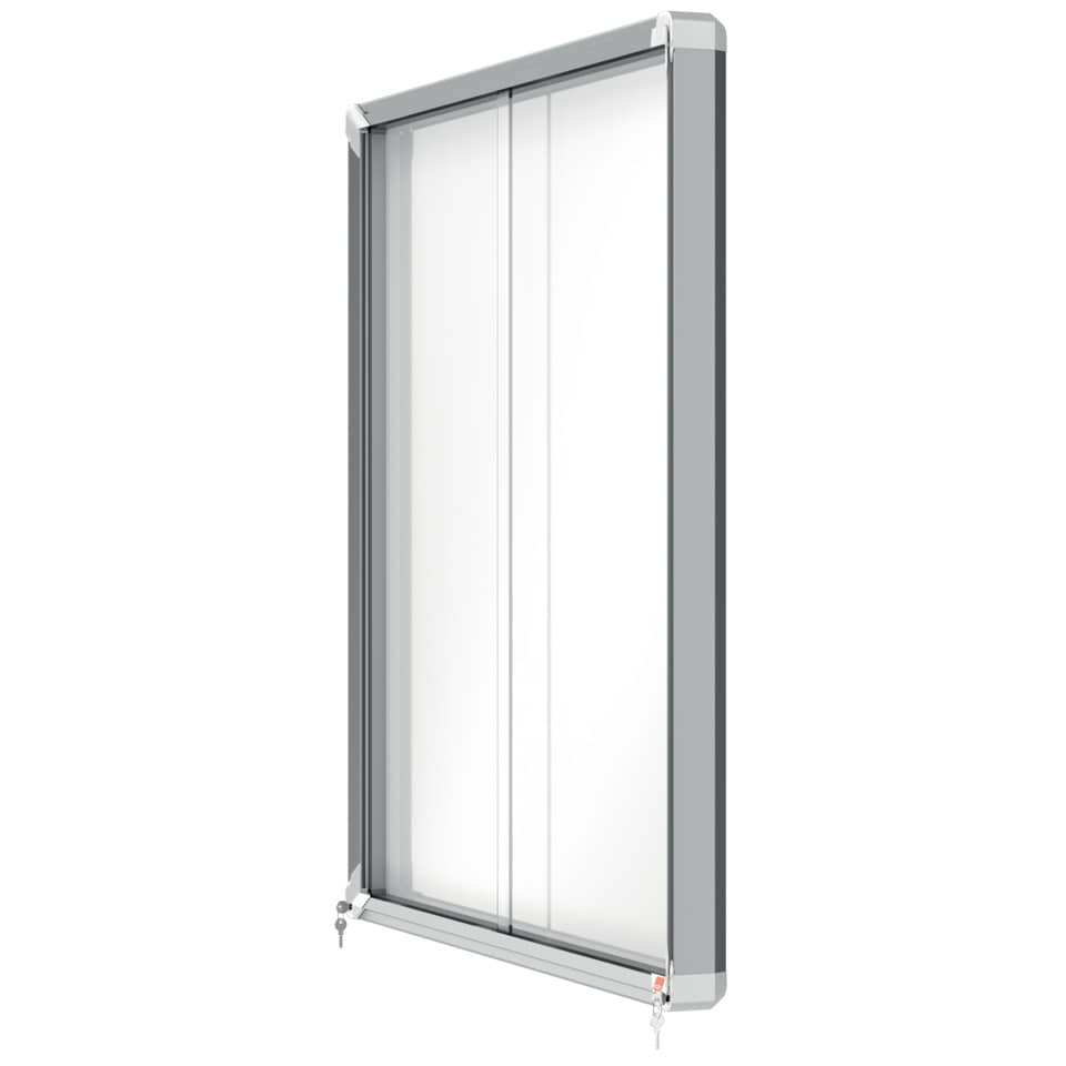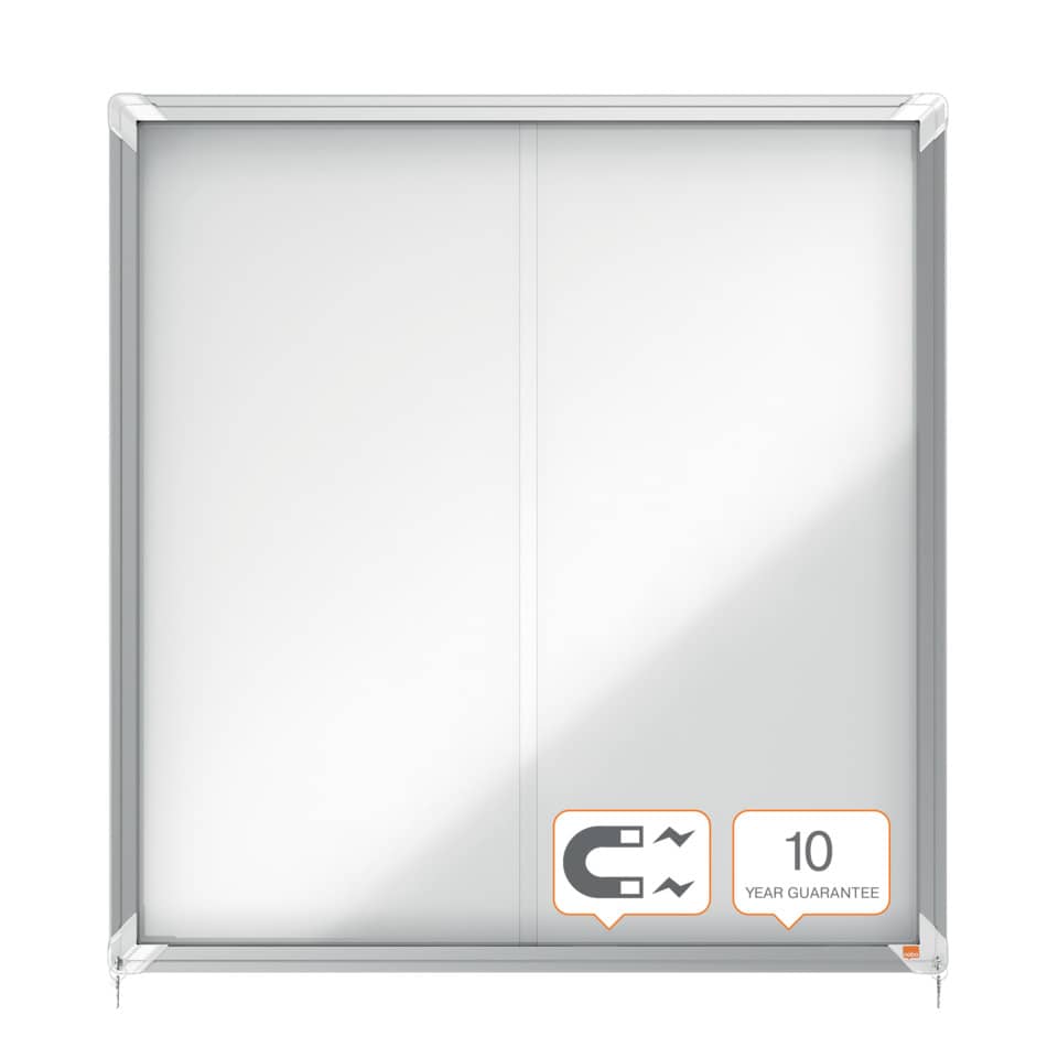 Bacheca magnetica con serratura con ante scorrevoli in vetro e serratura ad angolo. Con un elegante e moderna cornice in alluminio e sistema di montaggio angolare. Eccellente superficie magnetica per visualizzare in modo sicuro le tue note. Colore bianco. Capacità: 12xA4 - 92,4x97 cm. Garanzia di 10 anni. Testata secondo lo standard Europeo DIN EN 14434.