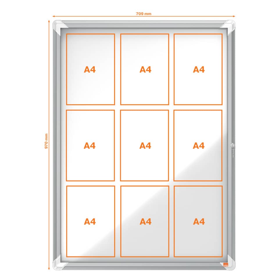 Bacheca magnetica con serratura con anta a battente e serratura laterale. Con un elegante e moderna cornice in alluminio e sistema di montaggio angolare. Eccellente superficie magnetica per visualizzare in modo sicuro le tue note. Capacità: 9 x A4.