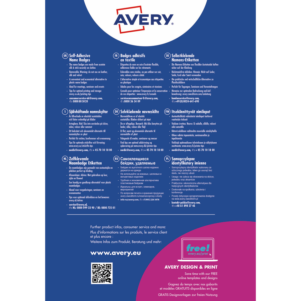 Badge adesivi per tessuti ovali Avery 85×50 mm – Bianco – 10 etichette per foglio – stampanti laser – L4882-20 (conf.20 fogli)