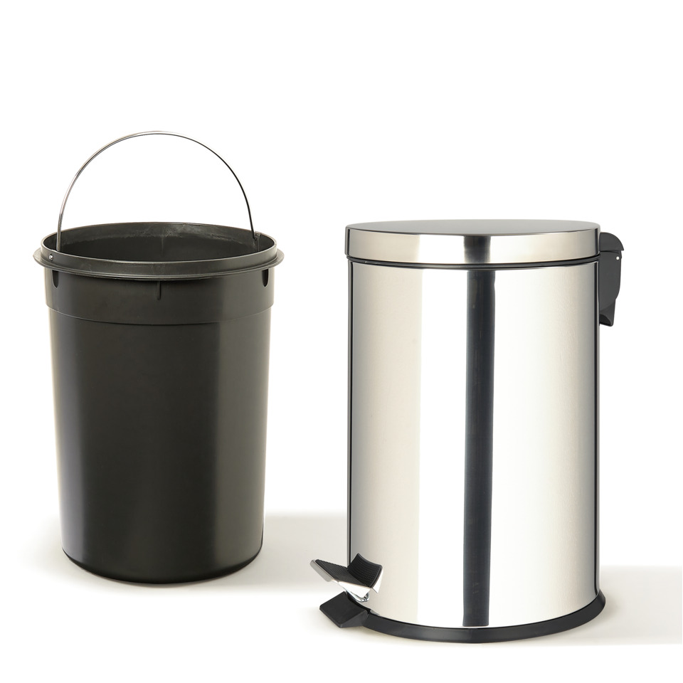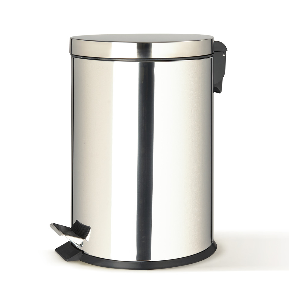Bidone con pedale in acciaio inox con chiusura rallentata (soft close) per un'apertura/chiusura silenziosa e igienica. Dotato di vaschetta interna per una gestione pratica del sacco. Capacità 20 L, ideale per bagno e cucina. Design robusto e facile da pulire. Dimensioni: Ø 34 x H.44,5 cm.