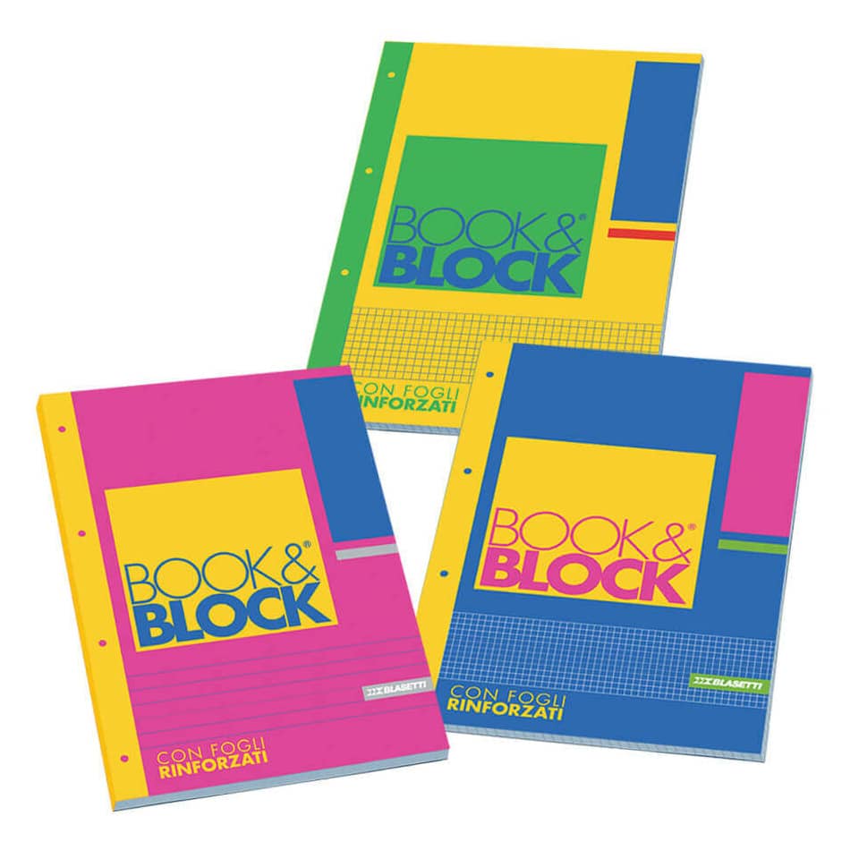 Blocco Book & Block Blasetti. Blocco da 40 fogli formato A4, collato sul lato lungo con fogli forati e rinforzati. Carta da 80gr con rigatura 1R. Codice produttore: 5722