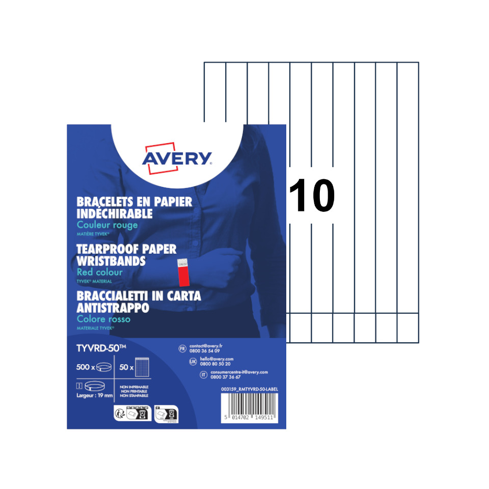 Braccialetti identificativi in Tyvek® Avery resistenti all’acqua – rosso fluo – TYVRD-50 (conf.500)