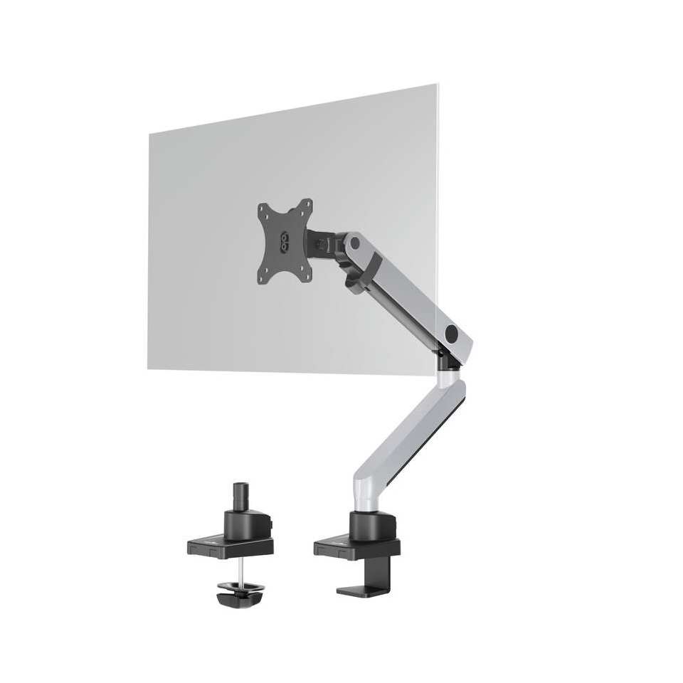 Braccio porta monitor con braccio estensibile per 1 monitor con doppia opzione di montaggio, con morsetto o perno per foro passacavo. Il monitor può essere regolato individualmente in altezza, inclinazione e orientamento per agevolare il lavoro ergonomico. Il monitor può essere ruotato di 90° per poterlo utilizzare sia in orizzontale che in verticale. Il braccio può essere posizionato facilmente grazie alla regolazione individuale della molla meccanica. Con montaggio universale VESA (75x75 mm o 100x100 mm). Per monitor standard fino a 32'' e con peso massimo fino a 8 kg. Gestione dei cavi: i cavi del monitor sono guidati lungo il supporto da scanalature interne e clip ferma cavo che ne evitano il danneggiamento. Dimensioni: 530x450x108mm. Colore: argento metallizzato.