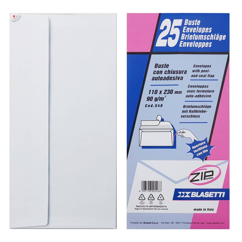 Busta bianca Blasetti Strip Zip in carta da 90 g/m2. Formato: 110 x 230 mm. Disponibile in confezione da 25 buste.