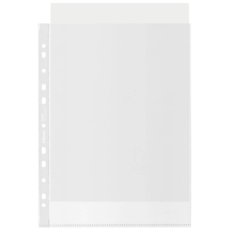 Banda rinforzata con perforazione universale a 11 fori per l'uso in qualsiasi raccoglitore ad anelli o con meccanismo a leva, il rinforzo è realizzato con una pellicola riciclata trasparente. Formato A4 con apertura in alto, ideale per l'uso in ufficio, a casa e a scuola. Superficie antiriflesso, qualità premium.