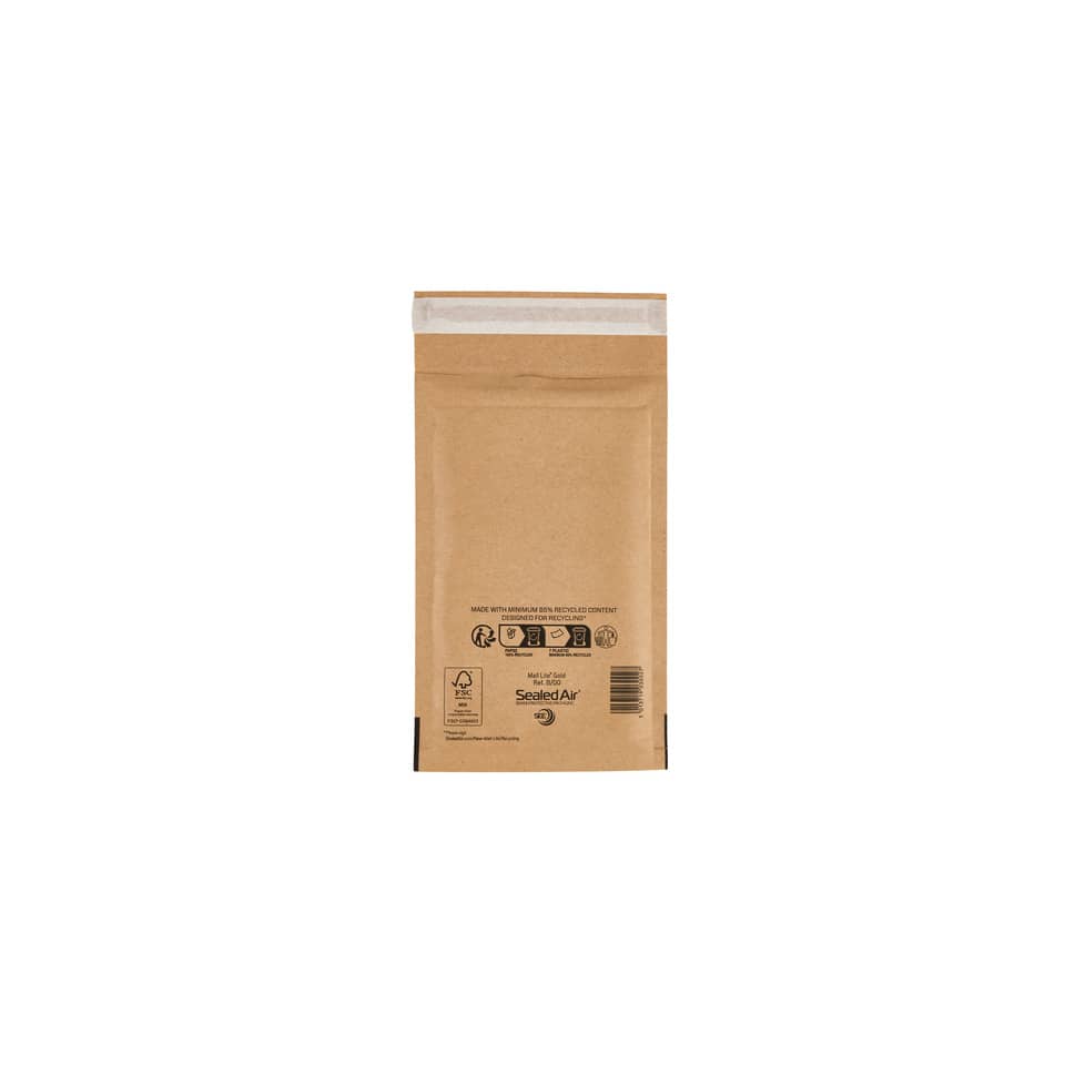 Buste Imbottite in carta avana ecologiche con imbottitura in pluriball. Leggere e resistenti, le buste Mail Lite® Gold consentono di risparmiare fino al 35% sulle tariffe di spedizione postale rispetto agli imballi tradizionali, garantendo contemporaneamente un'elevata protezione dei prodotti. Tipo B misura 12x21cm. Codice produttore: 103027401