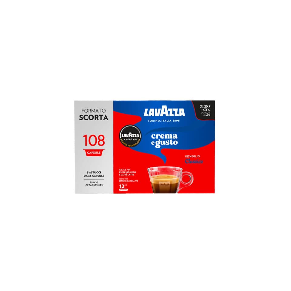 Capsule monodose di caffè macinato A Modo Mio Crema e Gusto confezione da 108 capsule. Dall'incontro di Arabica brasiliane e Robusta africane e asiatiche, un espresso corposo e aromatico, esaltato da note liquorose e cioccolatate, leggermente speziate. Peso netto: 810g.