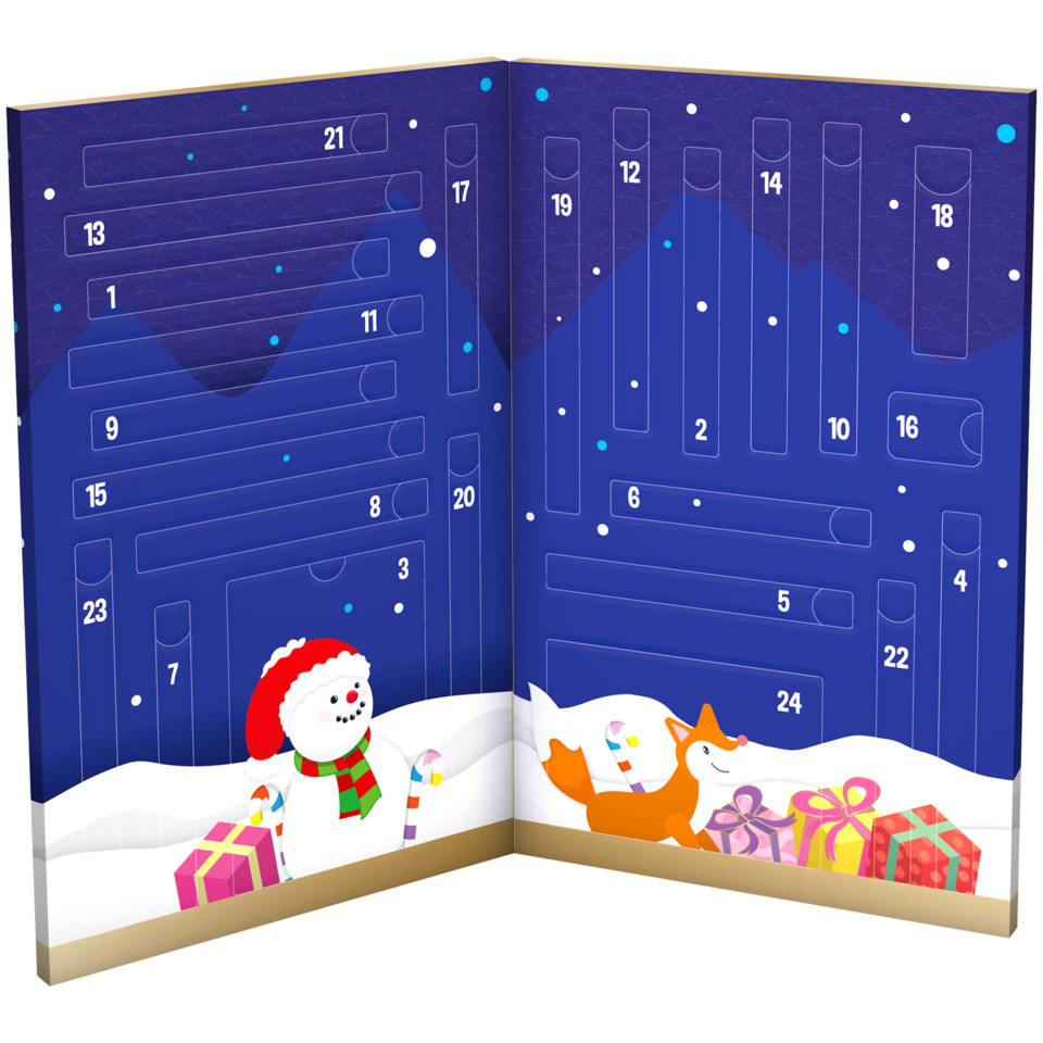 Il Calendario dell'Avvento BIC permette di esprimere il proprio talento con pastelli, pennarelli in feltro e altri accessori da scoprire per il conto alla rovescia fino a Natale. Composto da 24 caselle che contengono 24 articoli di cancelleria: una sorpresa per ogni giorno. È un ottimo regalo di Natale per bambini piccoli e grandi. Contenuto nel dettaglio: 2 penne a sfera CristalUP; 1 matita rossa a righe Evoution; 6 pastelli colorati; 6 pennarelli magici; 3 pennarelli; 1 tubetto di colla; 1 gomma; 2 mini penne a sfera a 4 colori; 24 cartoline colorate e 20 adesivi.
