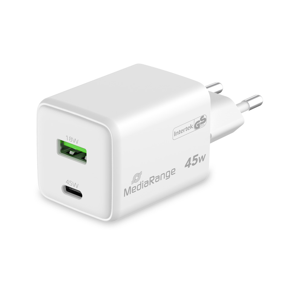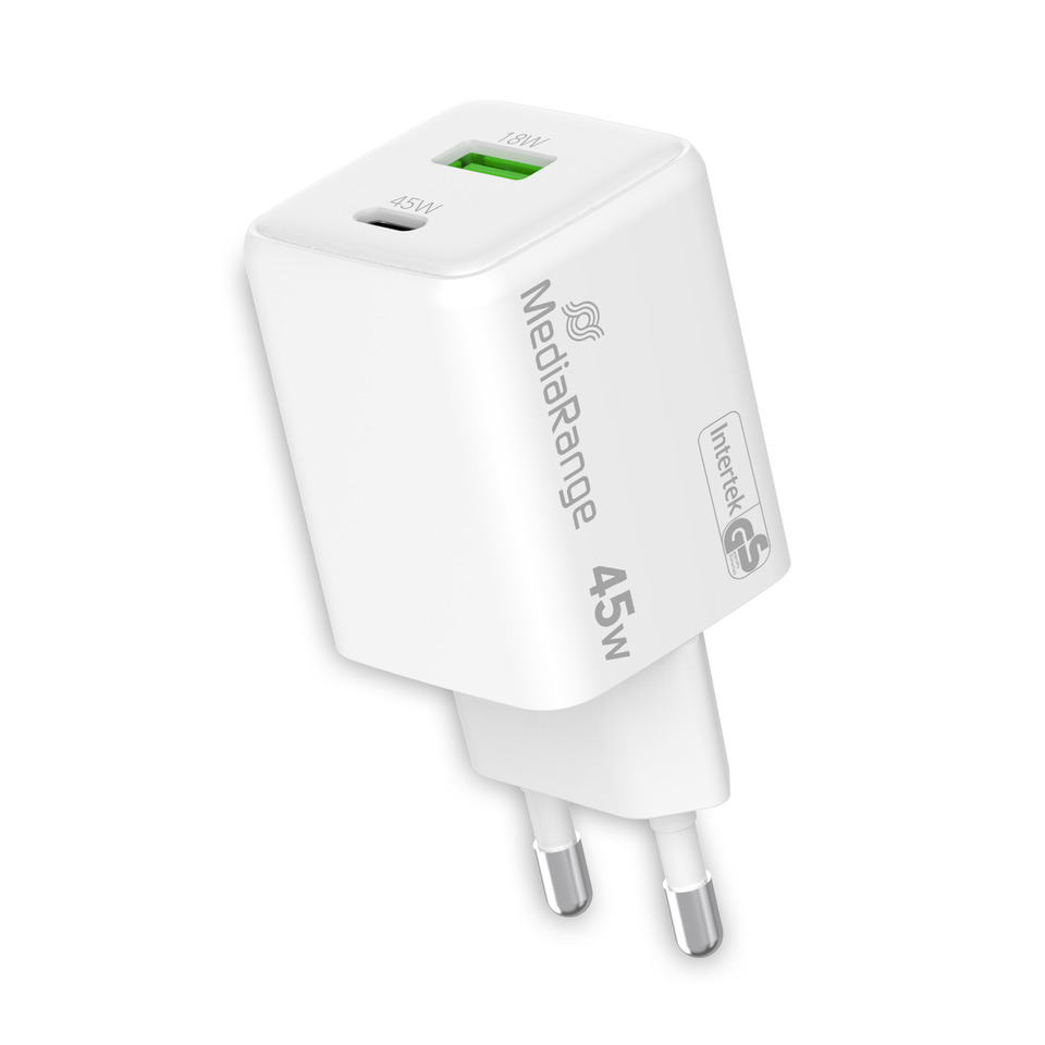 Caricabatterie rapido MediaRange 43W con uscita USB-A e USB-C, supporta tutte le comuni tecnologie di ricarica rapida e ha una potenza di ricarica massima di 43 W. Dotato di due porte di ricarica, 1x USB-C e 1x USB-A, è possibile collegare e caricare contemporaneamente fino a due dispositivi finali a un'unica presa. Compatibile con la tecnologia USB-C® Power Delivery e Quick Charge™. Apparecchio approvato da Intertek GS, protezione da sovratensione, protezione da sovraccarico, protezione da cortocircuito, protezione da surriscaldamento, dotato di un alloggiamento in policarbonato V0 resistente agli urti e al fuoco. Dimensioni: circa 83,1 x 35,8 x 35,5 mm.