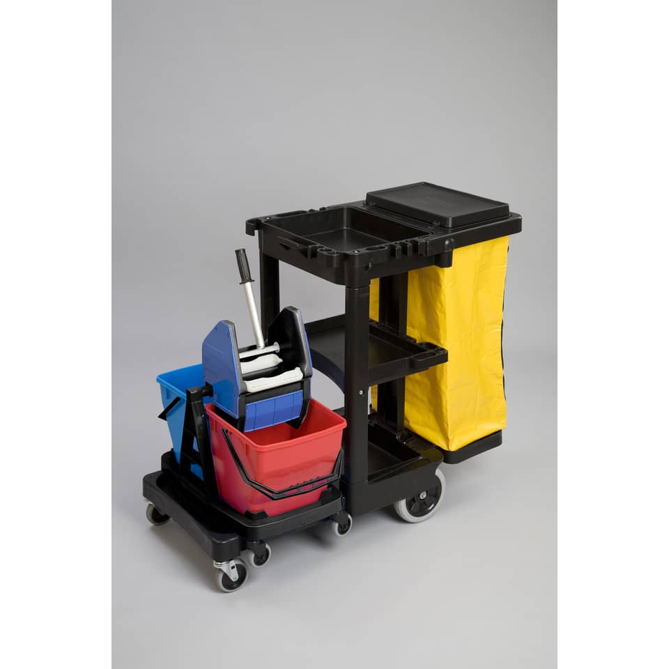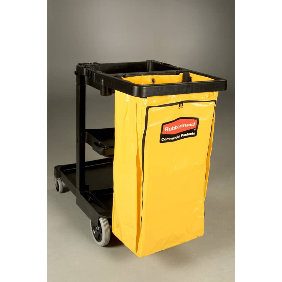 Carrello di pulizia con sacco di raccolta rifiuti in vinile giallo con zip di chiusura (per facilitare l'estrazione della spazzatura).
