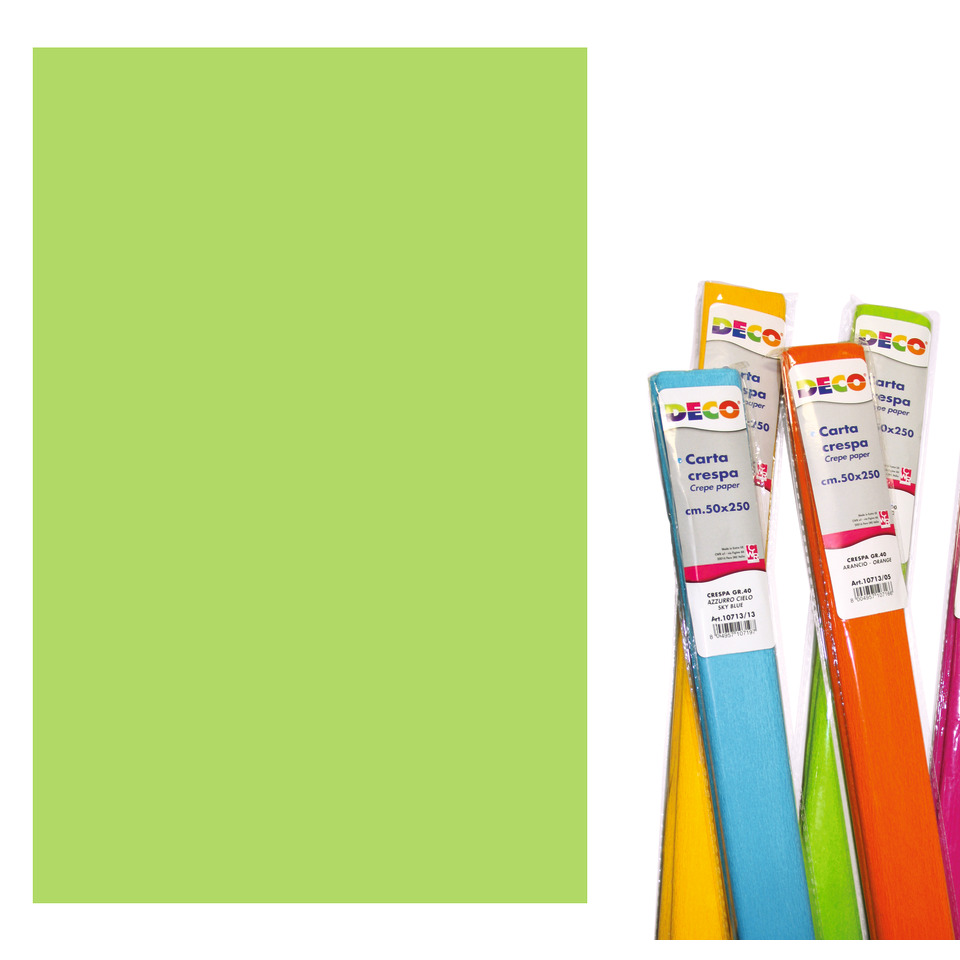 Carta crespa speciale scuola. Grammatura: 40 g/m². Formato: 50 x 250 cm. Colore verde chiaro.