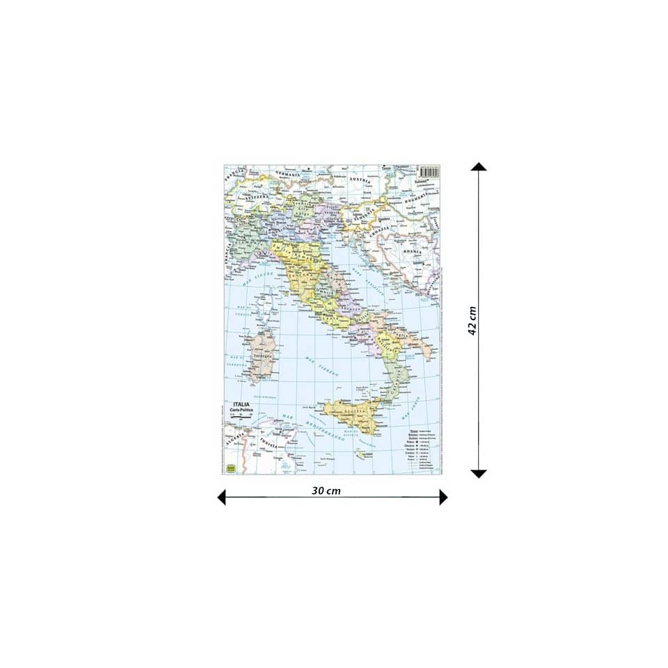 La cartografia dell'Italia è basata sulla proiezione conforme di Gauss-Boaga e rappresenta l'aspetto fisico dell'Italia da un lato e quello politico dall'altro. Il taglio comprende l'intero bacino dell'Adriatico. Nel lato con la parte fisica emerge la conformazione dei sistemi montuosi e dei fondali marini grazie a una scala di colori armonica che non disturba la leggibilità. La toponomastica, oltre a definire i principali elementi geografici, cura in particolare la delimitazione delle catene montuose con i relativi passi e si estende agli specchi d'acqua e alle regioni fisiche minori. Il lato con la versione politica è ricco di colori brillanti nel rispetto dell'armonia estetica e della leggibilità. all'interno delle regioni si distinguono le province con i rispettivi capoluoghi. Le città si distinguono per grandezza con una simbologia appropriata.In entrambe le versioni è curata la dizione italiana dei toponimi esteri e l'uso degli accenti è esteso alle parole sdrùcciole.Plastificata per fornire la massima protezione, è economica e duratura, ideata specificatamente per l'uso nelle scuole. Carta da banco dell'Italia, formato 30 x 42 cm (A3).