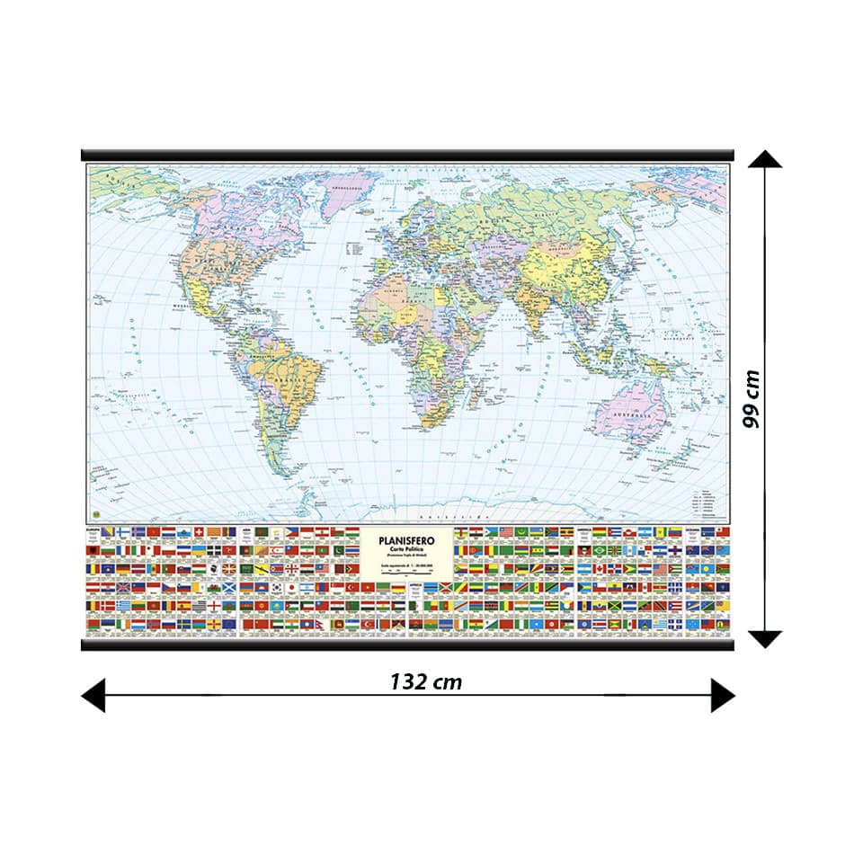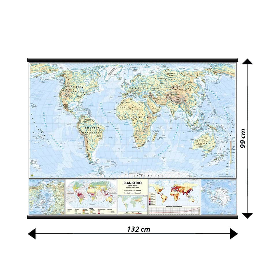 Carte murali scolastiche per la didattica, grazie alla cartografia basata sulla proiezione tripla di Winkel la carta del Mondo rappresenta l'aspetto fisico della terra su un lato e quello politico dall'altro. l'uso dei colori è bilanciato per salvaguardare sia la brillantezza che la leggibilità della carta. Le città si distinguono per grandezza con una simbologia appropriata. La parte fisica è completata dai riquadri dei poli, da alcune tavole tematiche riguardanti sismicità, clima, densità di popolazione e dal grafico dell'aumento mondiale della popolazione. La parte politica mostra le bandiere del mondo con i dati essenziali di tutte le nazioni. Grazie alla speciale plastificazione opaca antiriflesso è garantita un'ottima leggibilità in ogni condizione di luce. Cartina del Mondo, formato 132 x 99 cm.