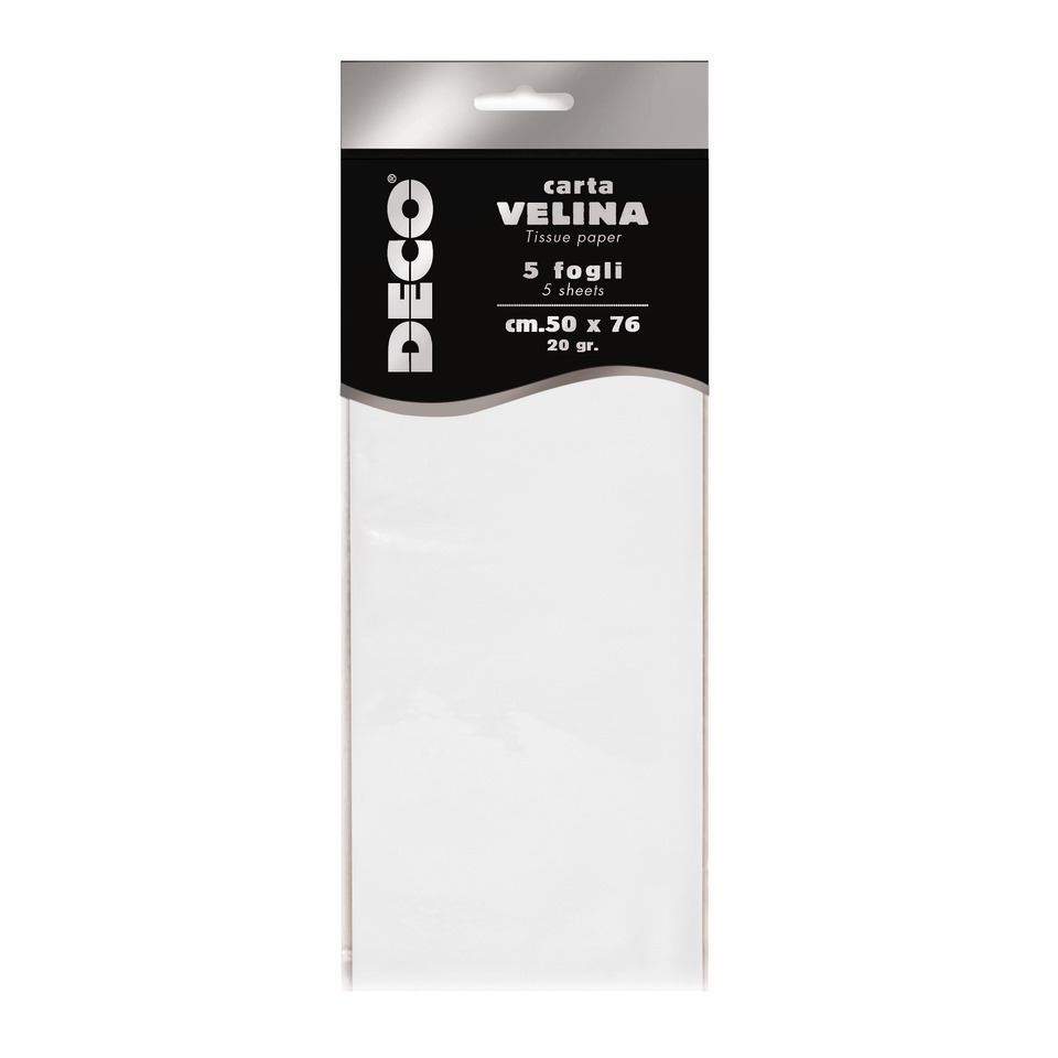 Carta velina in busta da 5 fogli appendibile. Formato: 50 x 76 cm. Grammatura: 20 g/m². Colore bianco perlescente.