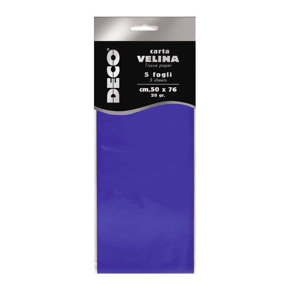 Carta velina in busta da 5 fogli appendibile. Formato: 50 x 76 cm. Grammatura: 20 g/m². Colore blu.
