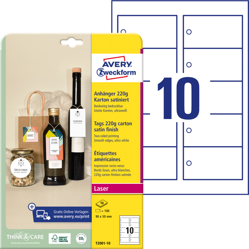 Cartellini in cartoncino da 220 g rettangolare con bordi lisci. Formato: 90x50 mm. Utilizzabile su stampante laser e stampabili su due lati. Certificati FSC®. Include il cordoncino. Confezione da 10 fogli ognuno da 10 cartellini, per un totale di 100 cartellini.