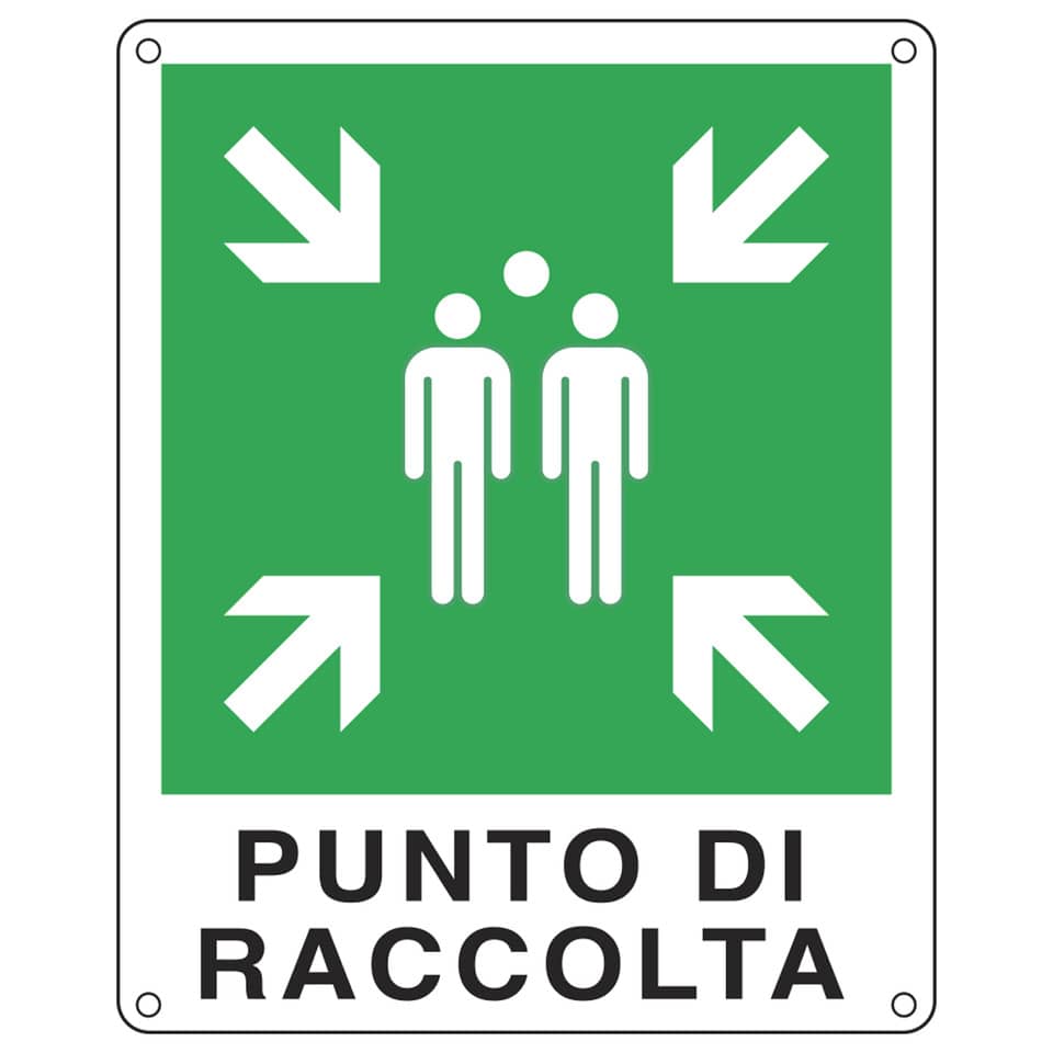 Cartello d'emergenza ''Punto di raccolta''. Sfondo bianco con immagine verde. Simbolo + testo. EN ISO 7010. Alluminio piano spessore 5/10. Dimensioni: 25x31 cm