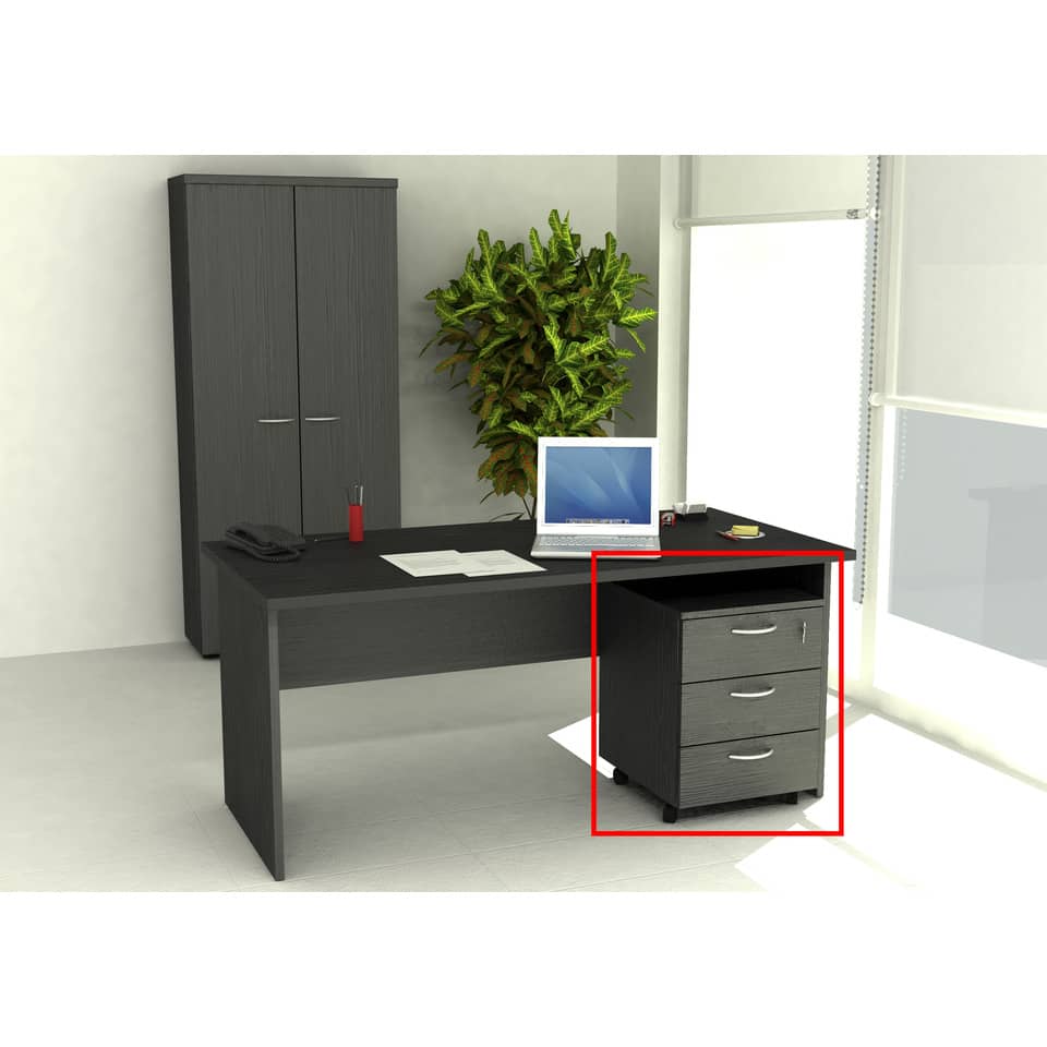 Cassettiera 3 cassetti, il primo con serratura, scorrevoli su guidemetalliche con fermo a fine corsa. Con ruote pivotanti. Dimensioni incm L43 P52 H59,5 cm, montata, nero ven. frassino