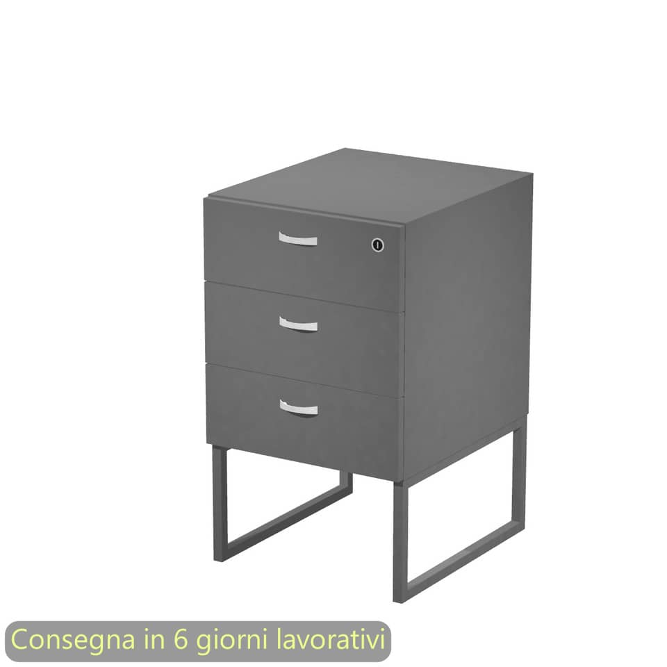 Cassettiera alta a 3 cassetti antracite laguna su supporto in metallo antracite opaco. La serratura si trova sul primo cassetto. I cassetti hanno guide metalliche con fermo a fine corsa. I piedini sono regolabili, in modo da permettere il posizionamento della cassettiera sotto il piano della scrivania. Fornita montata. Il supporto in metallo è da montare. Dimensioni: 41,5x50xH.72,2 cm. Produzione interna Artexport della parte in legno certificata Iso 9001. Certificazioni FSC e PEFC. Imballi totalmente in cartone per un facile riciclo, a basso impatto ambientale. Consegnata con scocca montata, supporto da montare. Senza ruote.