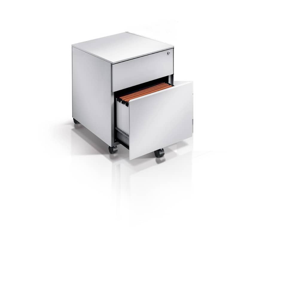 Oltre che nella versione a 1 cassetto più schedario, questo modello di cassettiera con serratura è disponibile anche nella versione a 3 cassetti e nella colorazione bianca.