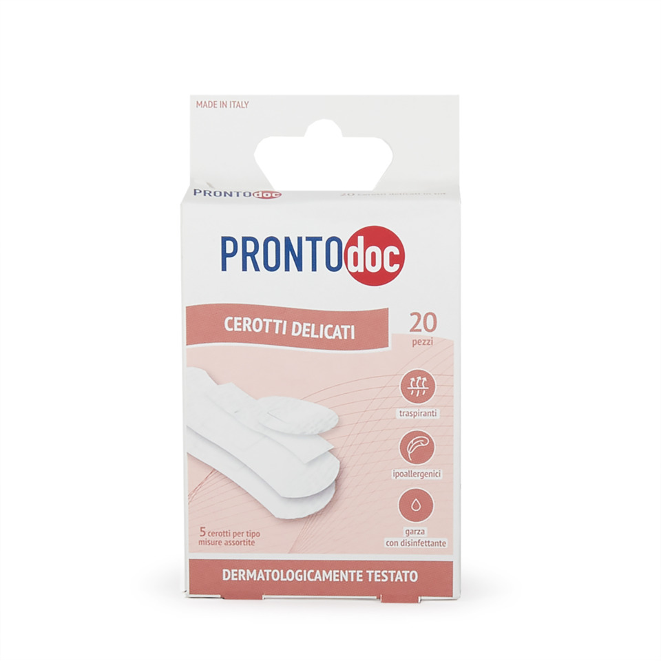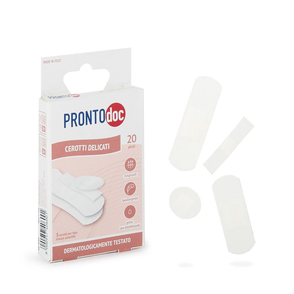 Cerotti delicati e traspiranti in tessuto non tessuto microperforato, ideali per pelli sensibili e per piccole lesioni. Dotati di garza assorbente a effetto antisettico con clorexidina digluconato per aiutare a prevenire le infezioni e mantenere sotto controllo il microambiente della ferita. Confezionati singolarmente per massima igiene. Dermatologicamente testati. Made in Italy. Confezione 20 pezzi.