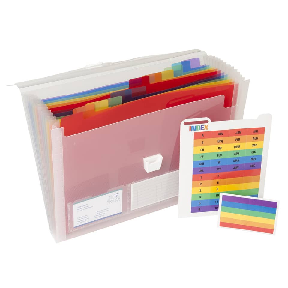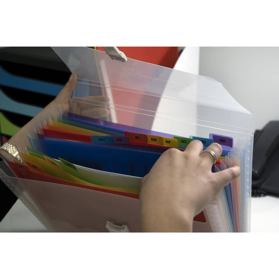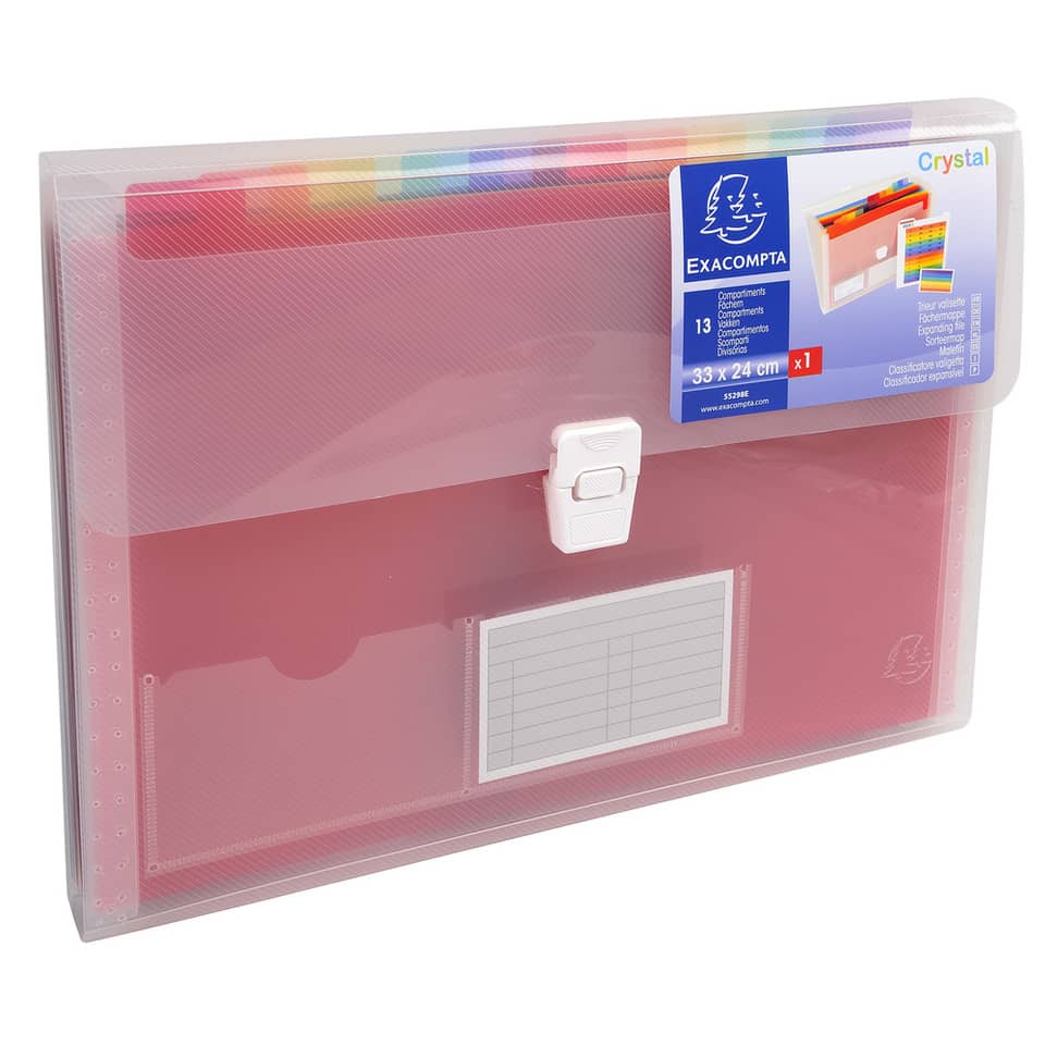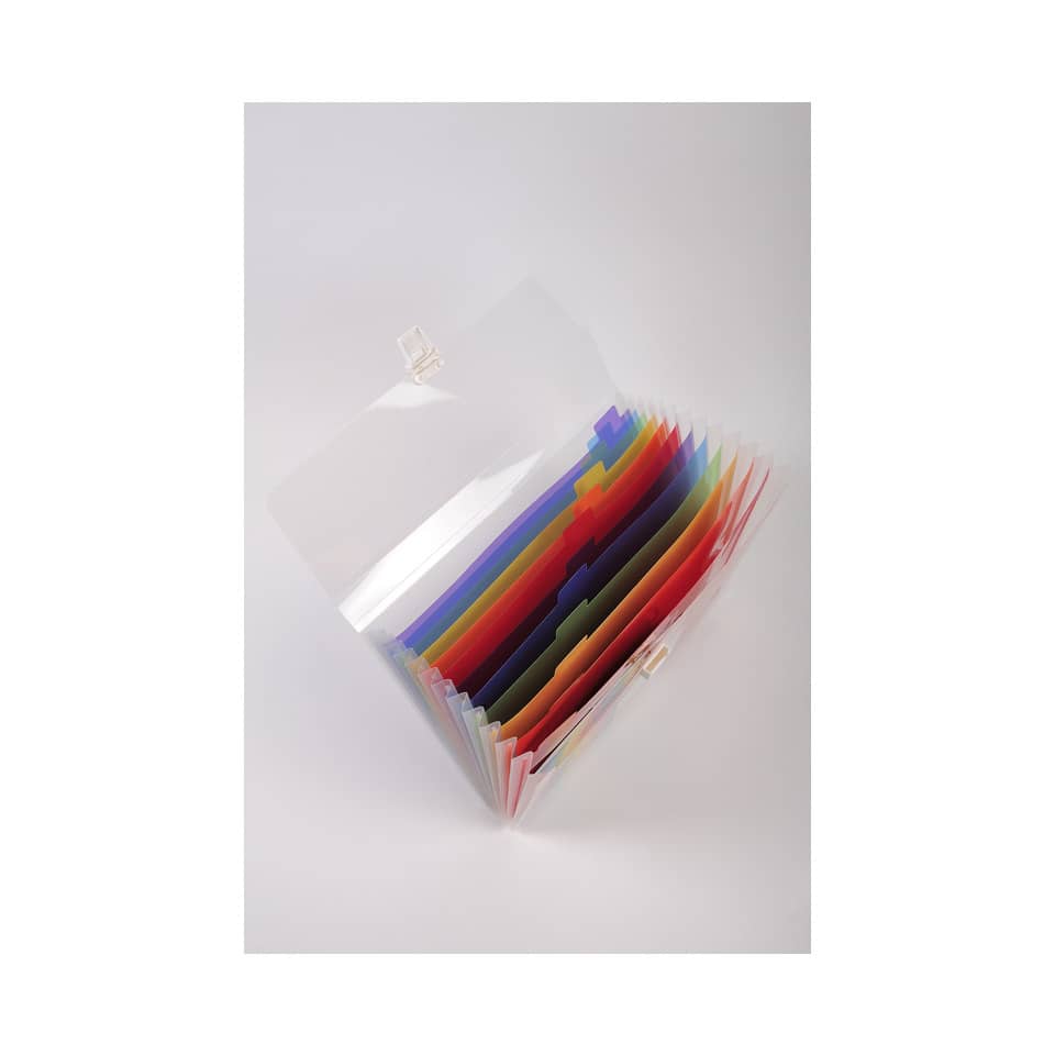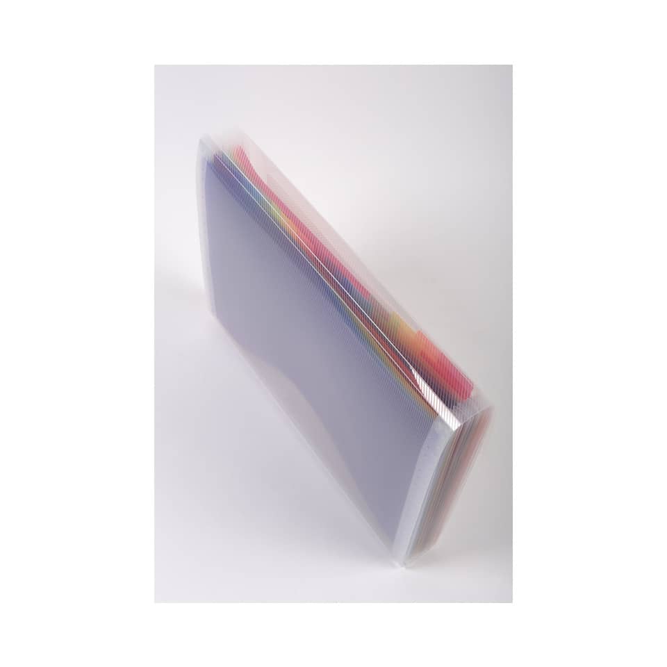 Classificatore 13 scomparti Crystal Colours, chiusura con bottone, Ppl cristallo rigato 700 micron, dorso estensibile, scomparti multicolori, F.to 33x25cm