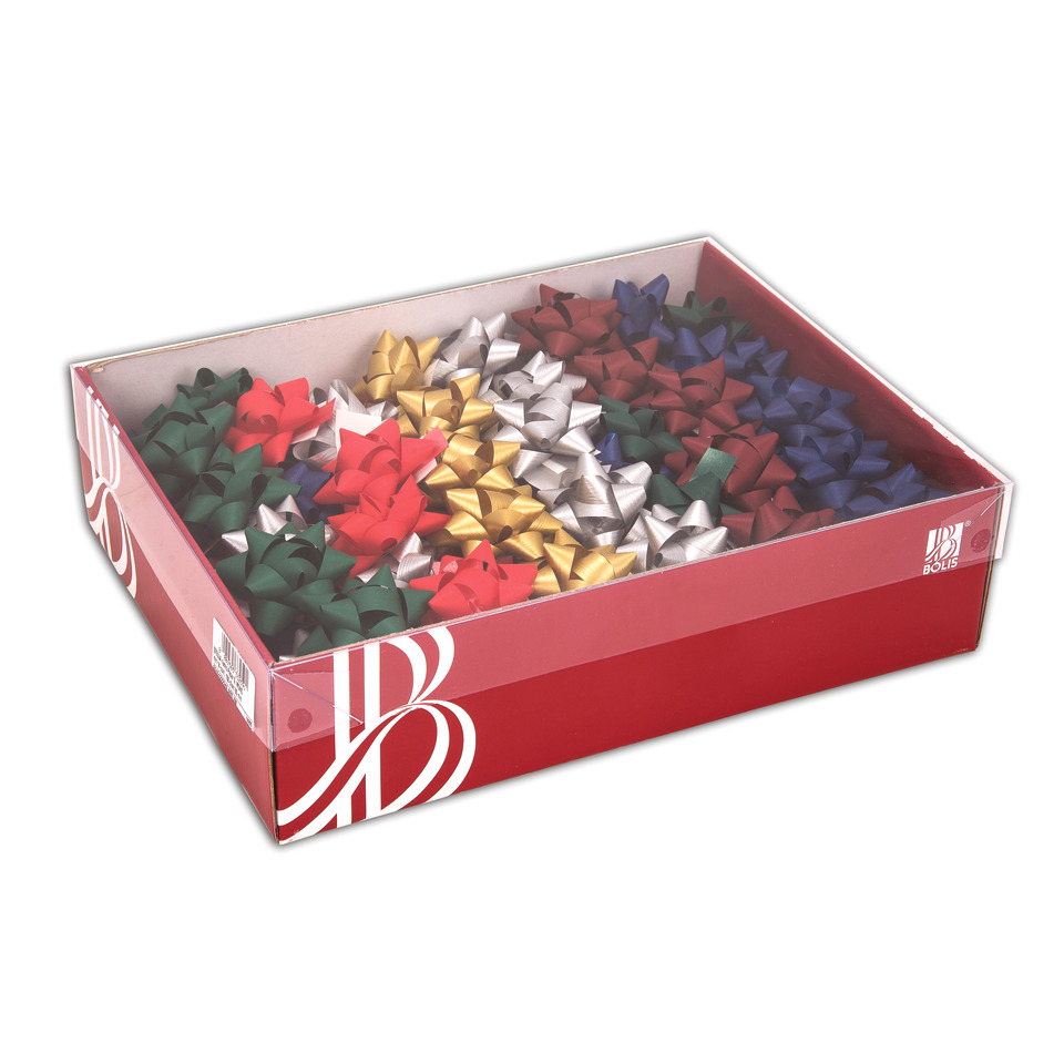 Coccarde in carta (paper synthetic) in colori assortiti. Assortimento Christmas (rosso, blu reale, bordeaux, verde pino, oro metallizzato, argento metallizzato). Confezione da 70 pezzi.
