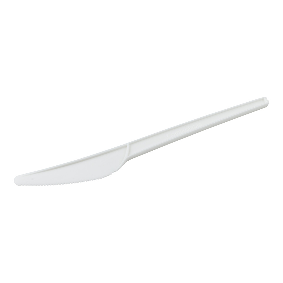 Coltelli in CPLA in busta biodegradabile e compostabile in PLA. Lunghezza: 165 mm. Peso: 3,8 grammi. Contenuto per confezione: 100 pezzi. Temperatura di esercizio: da -18 °C a +80 °C. Utilizzabile in freezer a basse temperature. Certificazioni: TUV INDUSTRIAL - DIN CERTCO. Prodotto PFAS free. Colore: bianco.