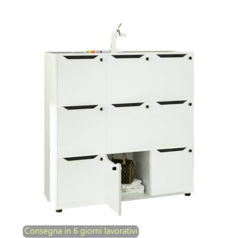 Contenitore 9 caselle a giorno bianco. Dimensioni: 119x40xH.121,6 cm. Top spessore: 18 mm. Fianchi, ripiani e base spessore: 18 mm. Dietro spessore: 10 mm. Ante spessore: 18 mm .Materiale bilaminato nobilitato melaminico spessore conforme norme UNI e EN classe E1, antigraffio ed antiriflesso. Programma di contenitori a 9 caselle allestibili a giorno oppure con ante complete di serratura. Ideali sia per l'archiviazione di documenti che in tutti quei contesti in cui è opportuno offrire la possibilità di lasciare oggetti personali custoditi all'interno di un vano chiuso a chiave. Il design delle ante permette, anche da chiuse, di inserire documenti all'interno della casella. Utilizzabile anche come casellario. Le singole caselle misurano 372x372 mm (L x H) e complete di ante hanno una profondità utile di 366 mm. Dotate di piedini livellabili in altezza. Disponibile nelle seguenti colorazioni. Struttura: 3-bianco e grigio alluminio. Ante: bianco, rovere, grigio alluminio, rosso, verde e viola scarlatto.