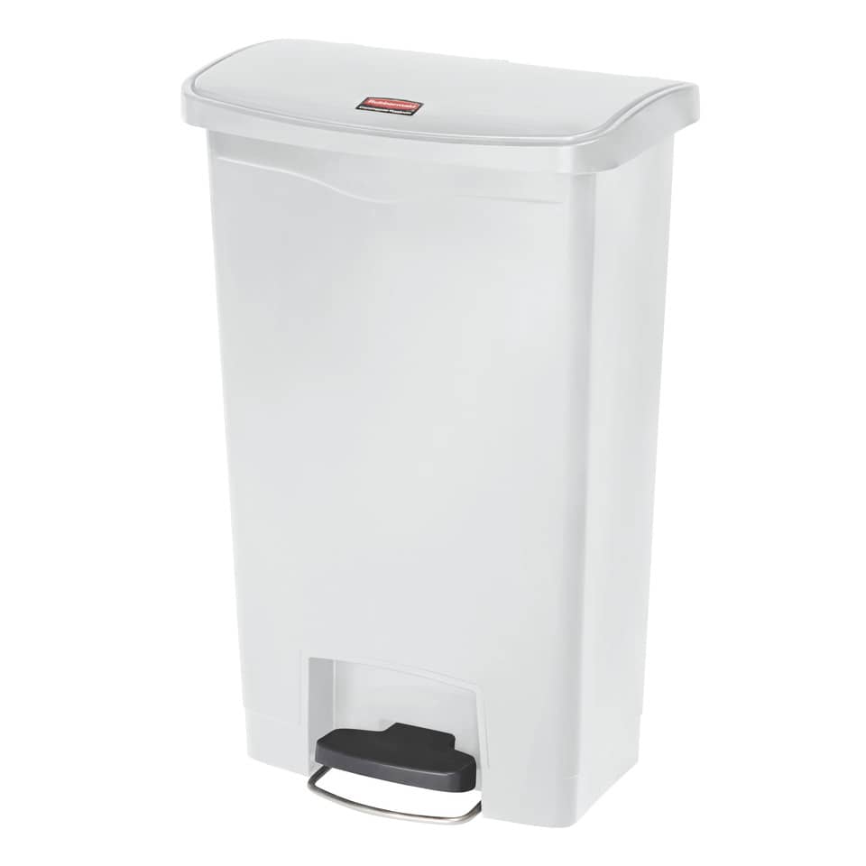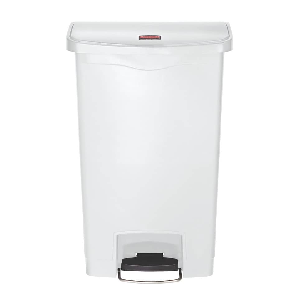 Contenitore rifiuti Slim Jim Step-On colore bianco, 50 litri Contenitore in resina con apertura frontale a pedale, si adatta agli spazi più ristretti: ' L'apertura a pedale evita il contatto con il coperchio e riduce il rischio di contaminazione incrociata (conformità HACCP) ' Minimo ingombro, risparmio di spazio. ' Coperchio silenzioso a chiusura ammortizzata ' Superficie facile da pulire ' Capacità 50 litri