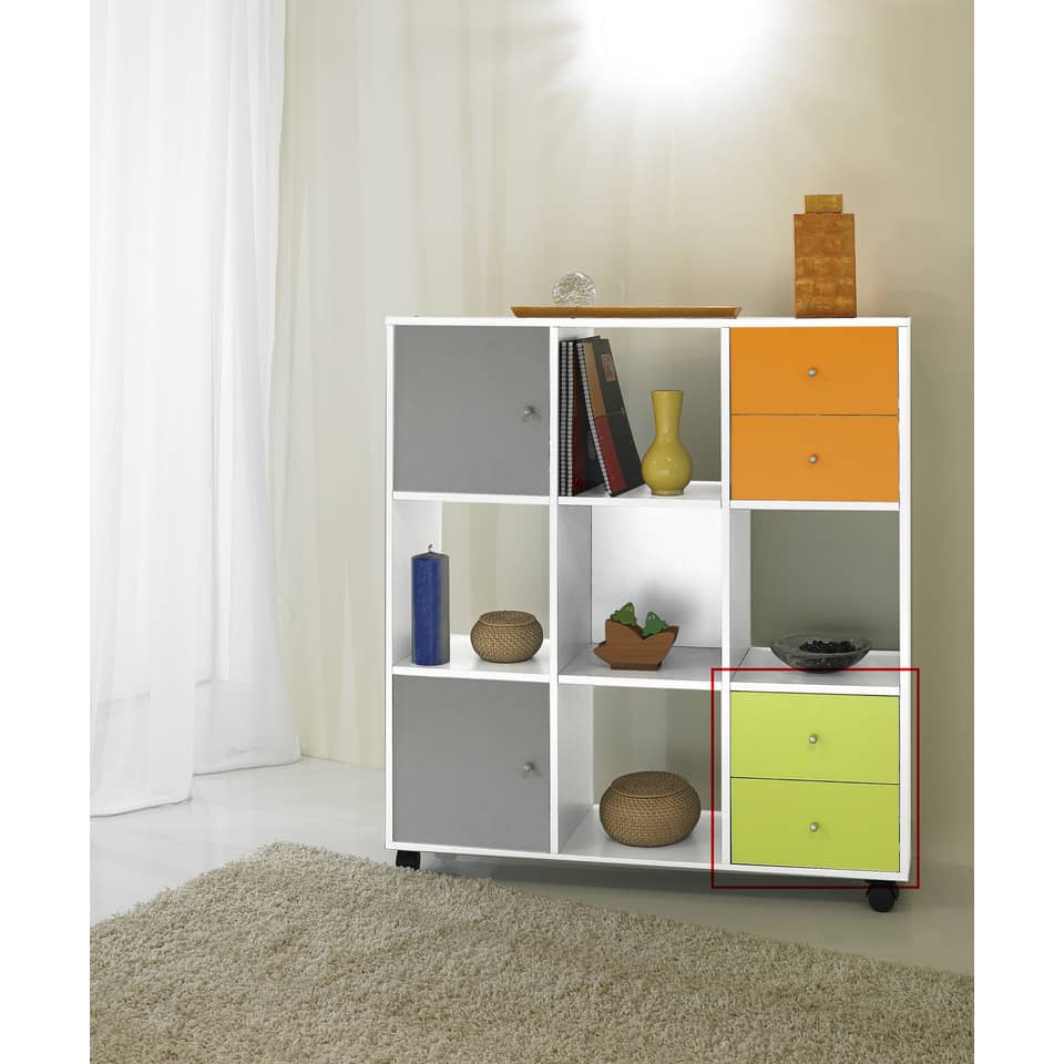 Set due cassetti per librerie a caselle. Entrambi i cassetti si inseriscono all'interno di una singola casella e possono essere montati da entrambi i lati della libreria. Completi di dietro. Colore verde neon.