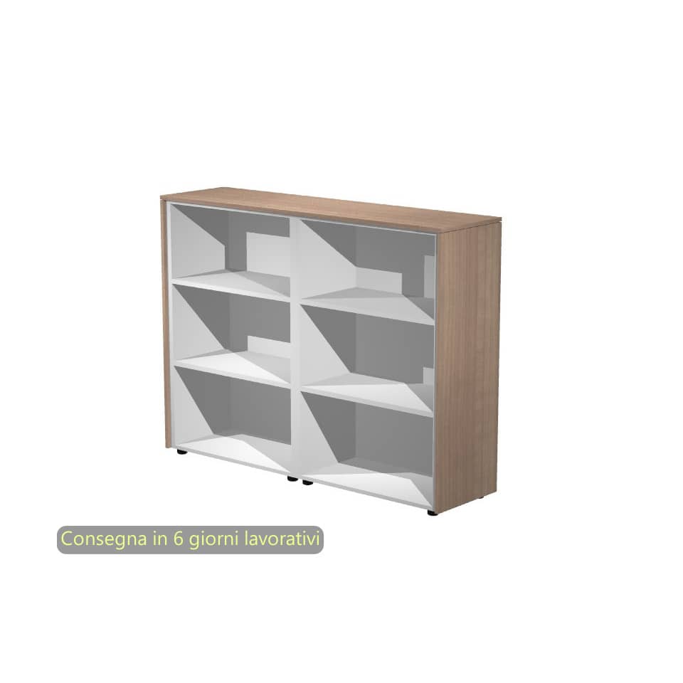 Coppia mobili medi a giorno completi di top unico e fianchi finitura. 2 ripiani (sp. 25 mm) regolabili in altezza. Rifiniti sul retro (sp. 10 mm), possono essere posizionati a centro stanza come elementi divisori. Piedini livellabili. Struttura (sp. 18 mm) colore grigio alluminio, top e fianchi finitura (sp. 14 mm) colore noce arabis. Dimensioni in cm: L163 P43 H119,8.