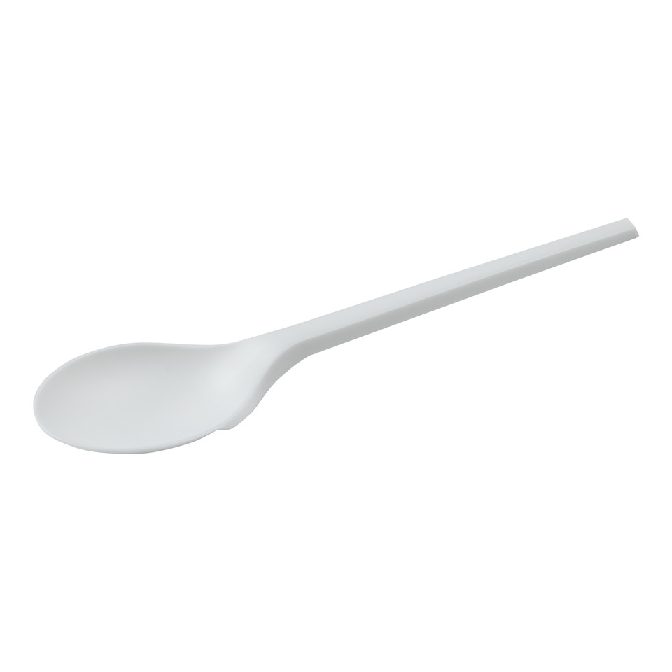 Cucchiaio in CPLA in busta biodegradabile e compostabile in PLA. Lunghezza: 165 mm. Peso: 4,5 grammi. Contenuto per confezione: 100 pezzi. Temperatura di esercizio: da -18 °C a +80 °C. Utilizzabile in freezer alle basse temperature. Certificazioni: TUV INDUSTRIAL - DIN CERTCO. Prodotto PFAS free. Colore: bianco.