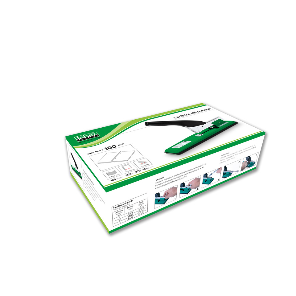 Cucitrice alti spessori in metallo con impugnatura ergonomica soft grip. Cuce fino a 100 fogli da 80 g. Profondità di cucitura 6.5 cm. Monta 3 tipi di punti: 23/8 = 11.5 x8 mm; 23/10 = 11.5 x10 mm; 23/13 = 11.5 x13 mm. Colore verde.