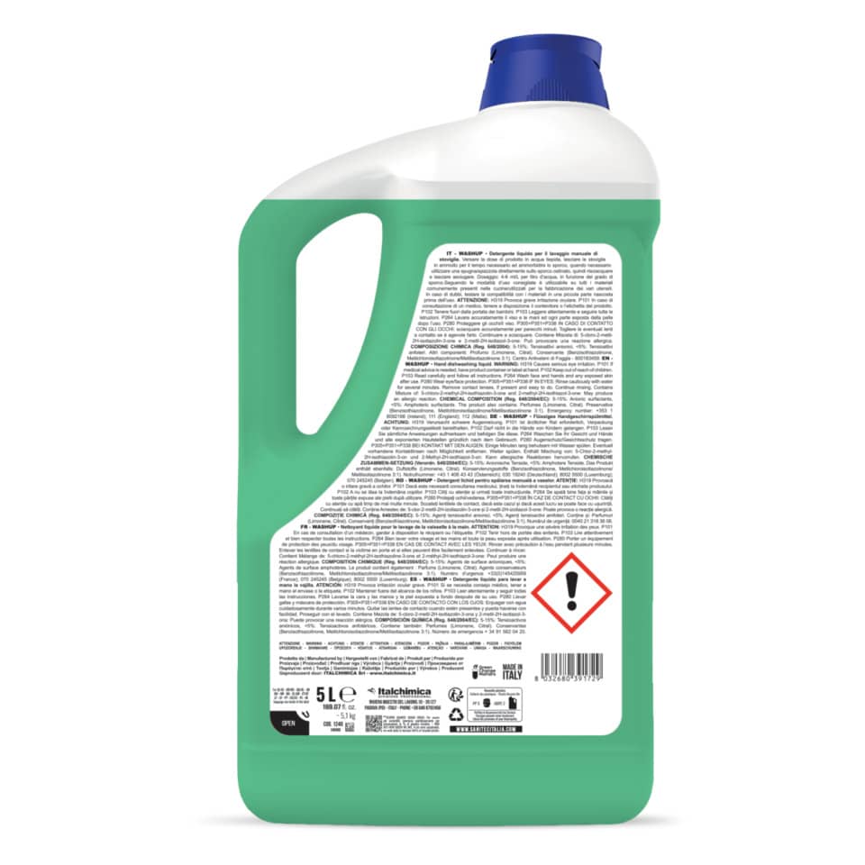 Detergente liquido Sanitec per il lavaggio manuale delle stoviglie, sgrassa a fondo. Prodotto a pH neutro, delicato sulla pelle, forma una schiuma compatta facilmente risciacquabile che non lascia aloni. Fresca profumazione che facilita la rimozione degli odori da stoviglie, posate e bicchieri. Prodotto idoneo all'autocontrollo H.A.C.C.P. Contenuto: 5 L / 5,1 Kg.