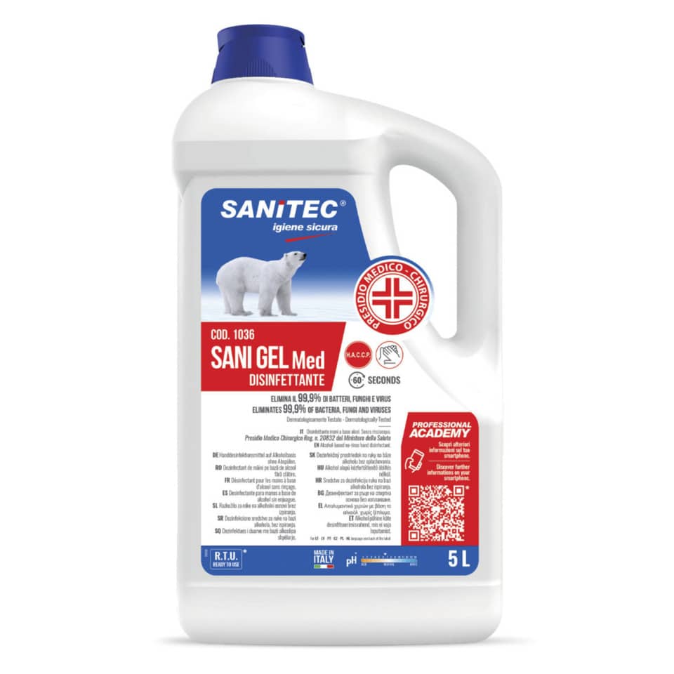 Disinfettante mani a base alcol senza risciacquo SANI GEL MED 5 Lt. Presidio medico chirurgico. Disinfettante idroalcolico per l’antisepsi della cute. Elimina 99,9% dei batteri, funghi e virus entro 60 secondi. Con agenti idratanti. Può essere utilizzato in qualsiasi ambito: sanitario, istituzionale, industriale e domestico.