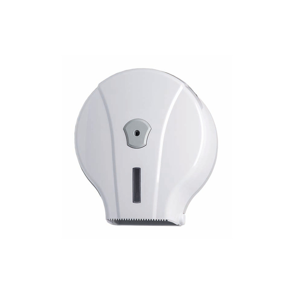 Distributore di carta igienica in rotolo Medial Wave bianco. Per rotolo carta igienica da 200 m (max Ø 190 mm); mandrino con diametro standard da 40 mm; adattatore per mandrino, con diametro 55 mm. Lame su tre lati per facilitare il taglio della carta; finestra per il controllo del livello della carta; serratura in plastica; design ricercato; kit d'installazione incluso (viteria e tasselli). Dimensioni: 240 x 130 x 260 mm.