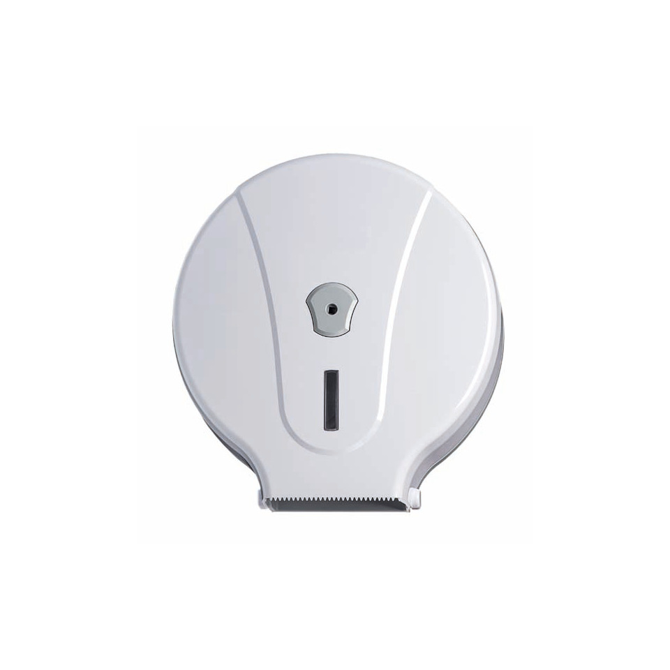 Distributore di carta igienica in rotolo Medial Wave bianco. Per rotolo carta igienica da 400 m (max Ø 250 mm); mandrino con diametro standard da 40 mm; adattatore per mandrino, con diametro 55 mm. Lame su tre lati per facilitare il taglio della carta; finestra per il controllo del livello della carta; serratura in plastica; design ricercato; kit d'installazione incluso (viteria e tasselli). Dimensioni: 310 x 130 x 330 mm.