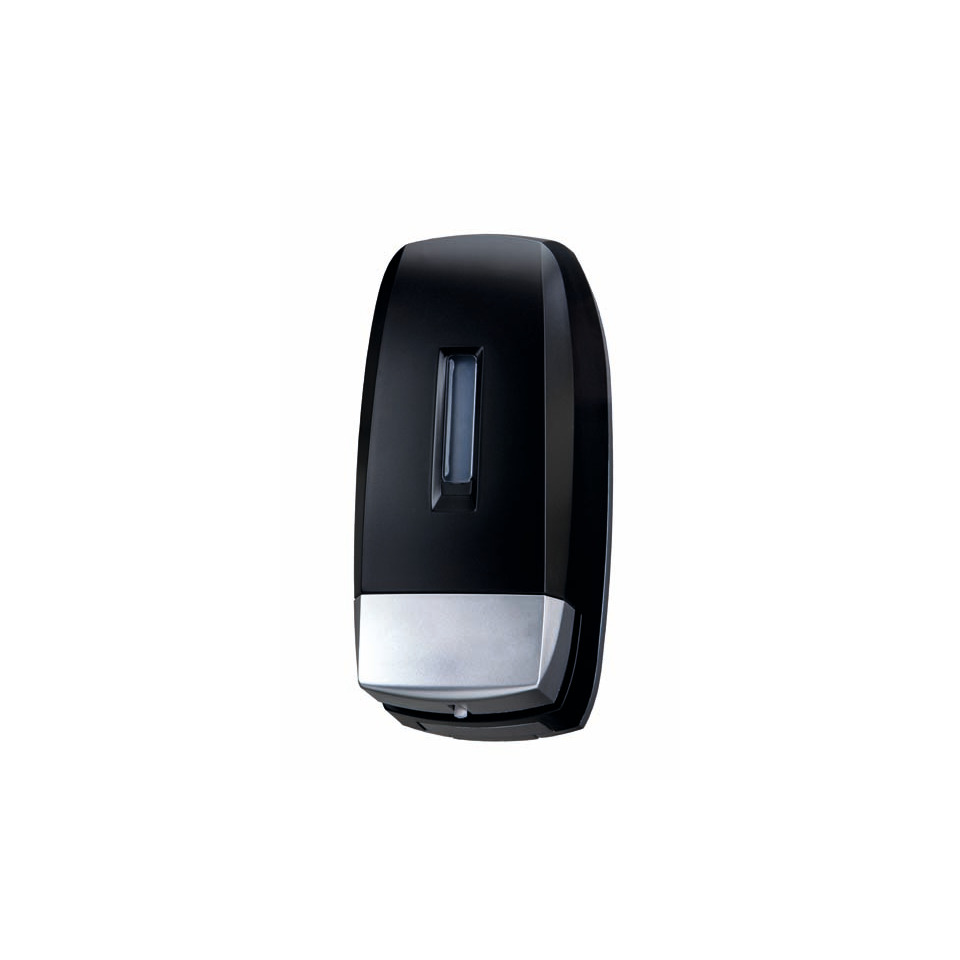 Distributore di sapone liquido Medial Noir. Distributore con serbatoio in plastica a riempimentoo da 0,5 lt per tutti i tipi di sapone liquido, salvo quelli a microgranuli. Sistema di erogazione “push” anti-gocciolamento. Kit d'installazione incluso (viteria e tasselli). Dimensioni: 101 x 93 x 209 mm. Base in ABS argento e cover in ABS nero.