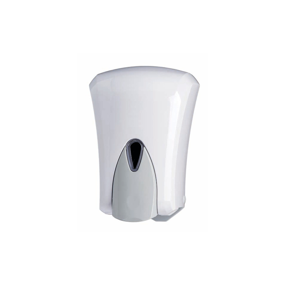Distributore di sapone liquido Medial Wave bianco. Base in ABS grigio e cover in ABS bianco. Distributore con serbatoio in plastica a riempimento da 1 lt per tutti i tipi di sapone, salvo quelli a microgranuli. Sistema di erogazione “push” anti-gocciolamento; finestra per il controllo del livello del sapone; serratura in plastica; kit d'installazione incluso (viteria e tasselli). Dimensioni: 155 x 125 x 220 mm.